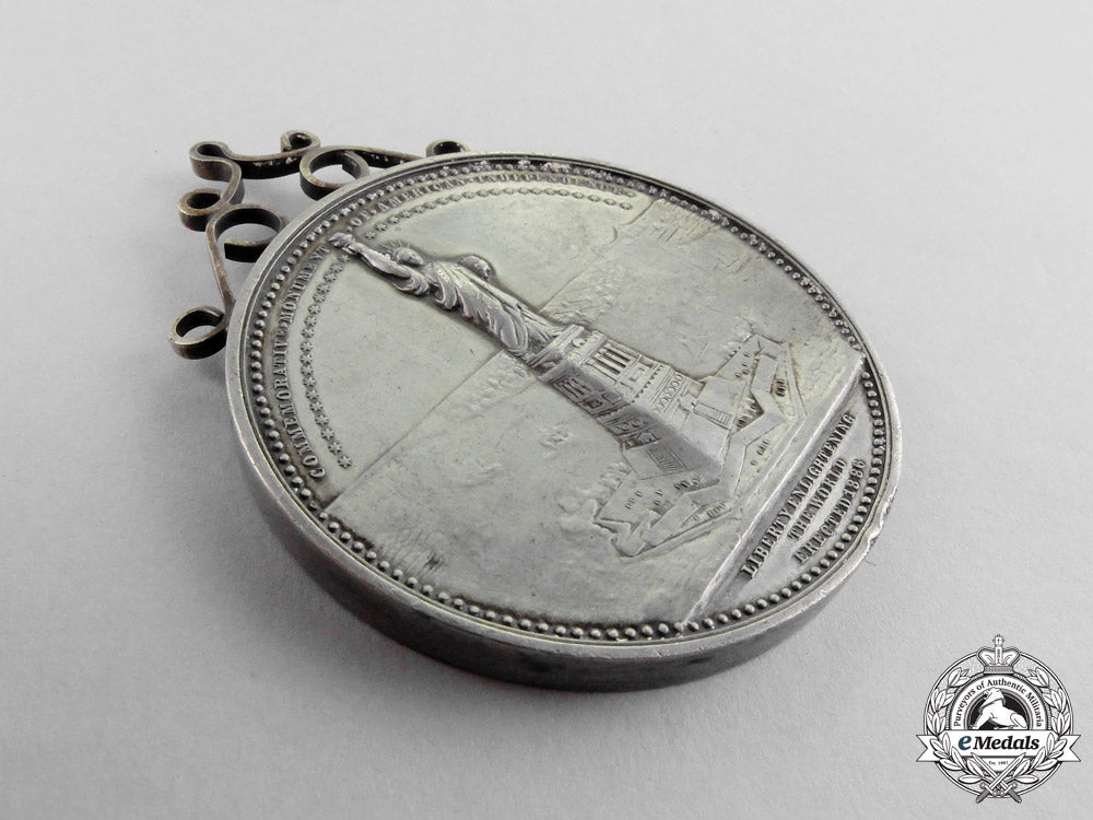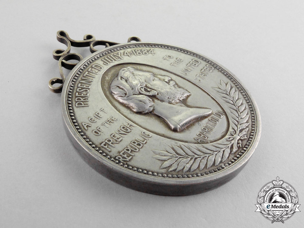 In silver, obverse illustrating the right-facing bust of the designer of the Statue of Liberty, French sculptor Frédéric Auguste Bartholdi, engraver marked ""BARBER F."" on the base of the bust, inscribed ""A. BARTHOLDI"" below, all within an oval vignette, the bust surrounded by the inscriptions ""PRESENTED JULY 4:1884"" above, ""A GIFT OF THE FRENCH REPUBLIC"" at the left and ""TO THE UNITED STATES"" at the right, with crossed branches of laurel leaves below, surrounded by a beaded border, reverse illustrating the Statue of Liberty in New York Harbor, ships active in the harbor, with the Brooklyn Bridge in the distance at the far right, inscribed ""COMMEMORATIVE MONUMENT OF AMERICAN INDEPENDENCE"" above a row of thirty-eight six-sided stars, one for each state as of 1884, inscribed ""LIBERTY ENLIGHTENING THE WORLD / ERECTED 1886"" below the statue, surrounded by a beaded border, 58.5 mm (w) x 76 mm (h) inclusive of its added-on ornate suspension, edge nicks, light contact, near extremely fine.