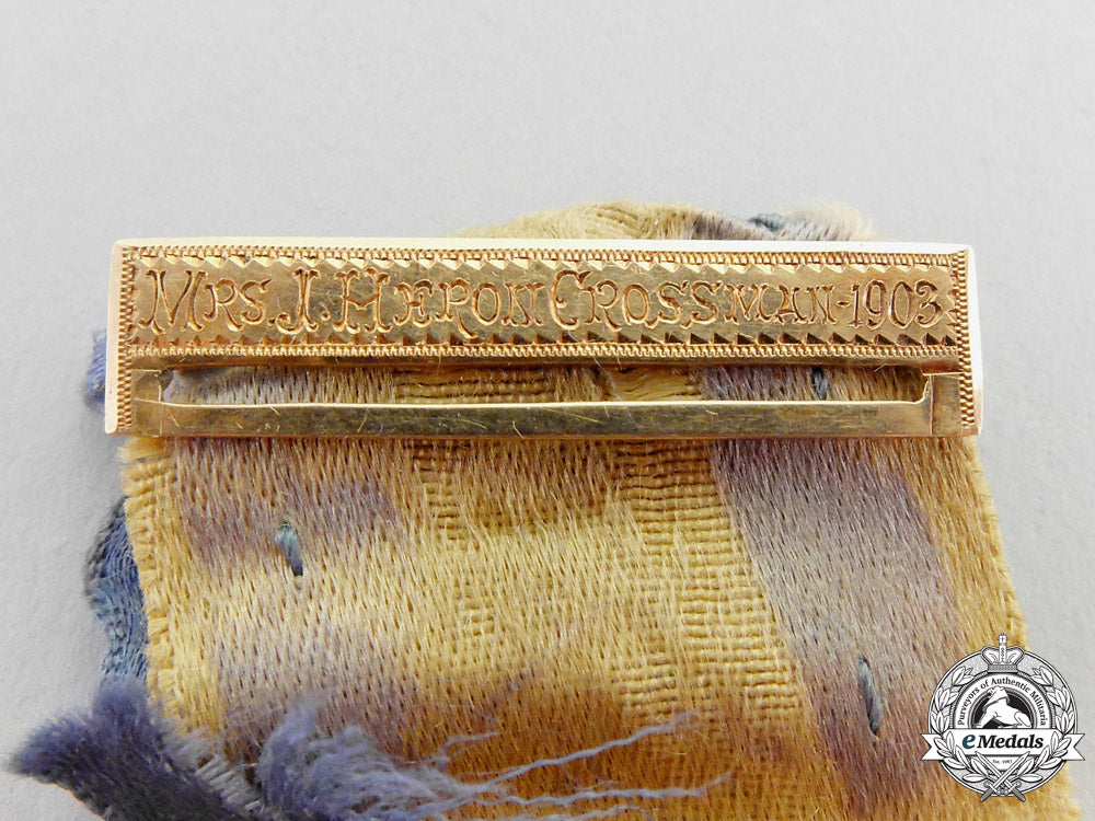 In gold with blue enamels, weighing 6.3 grams grams inclusive of its ribbon and hanger, measuring 28.8 mm (w) x 29.2 mm (h), frayed original ribbon, suspended from a Gold hanger engraved ""MRS. J. HERON CROSSMAN - 1903"", intact enamels, extremely fine.