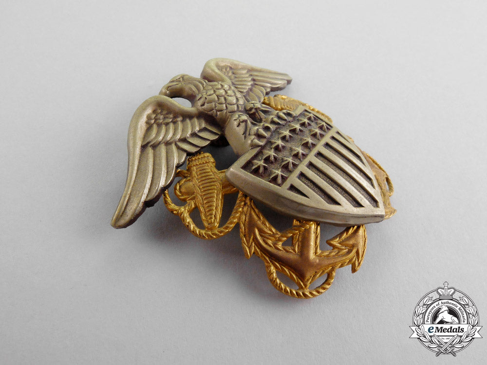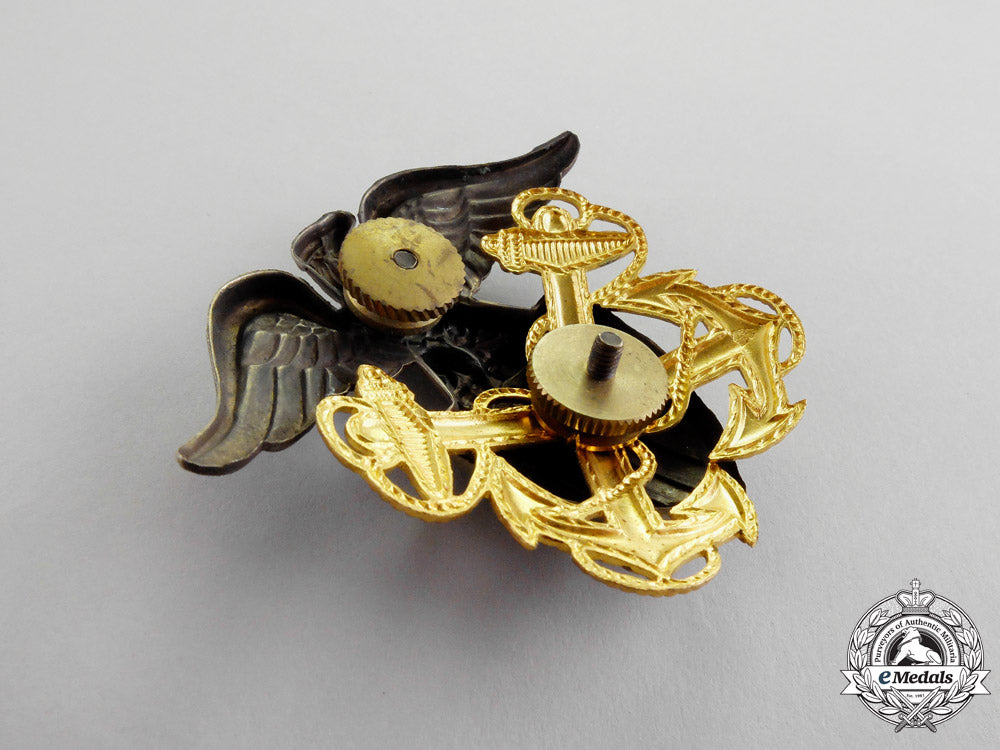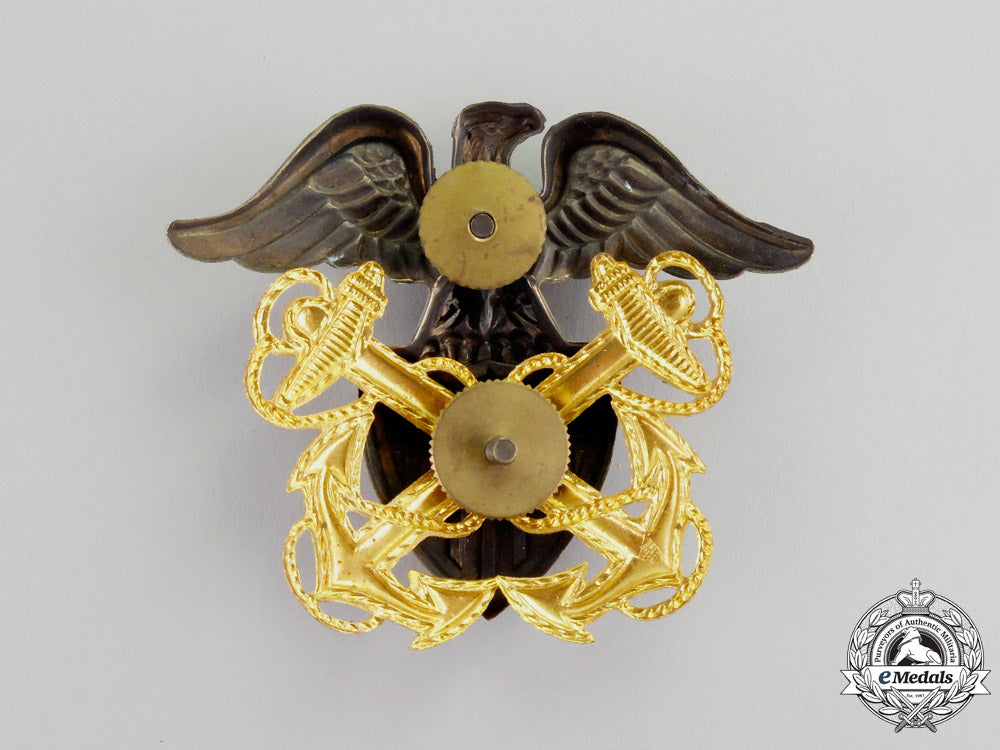 Two-piece construction, silvered nickel eagle and shield insignia, mounted to a die-stamped bronze gilt crossed fouled anchors base, unmarked, 64.7 mm (w) x 56.7 mm (h), dual screwbacks, extremely fine.