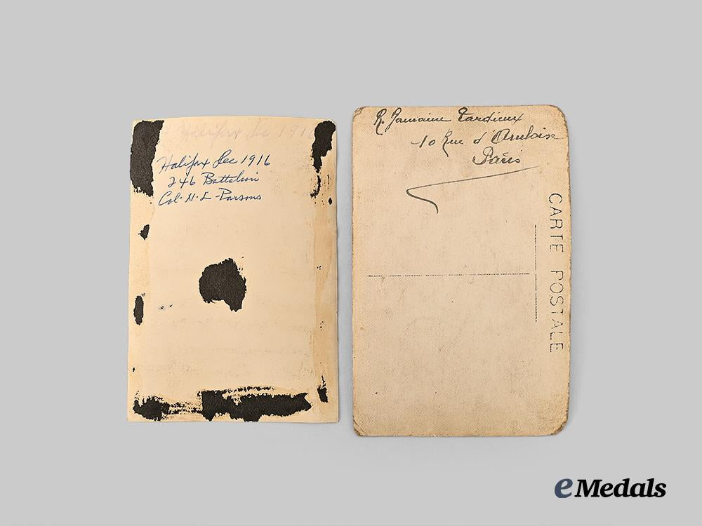 Two black and white photographs of Fillmore, one dated Halifax December 1916, and the other is a postcard from Paris, both exhibiting slight wear, but remain very fine,