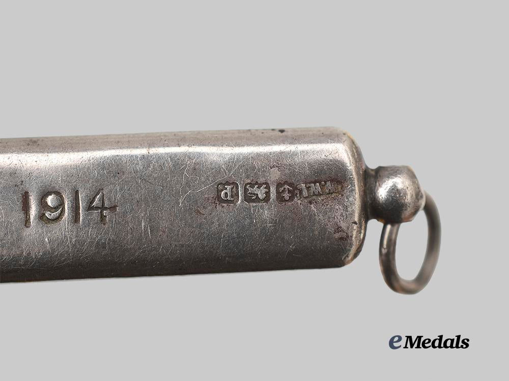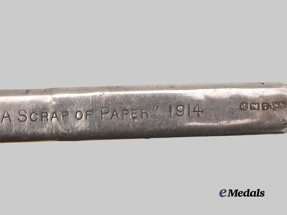 A small silver and enamel pencil holder, bearing six enamelled flags, engraved FOR ‘A SCRAP OF PAPER’ 1914, with silver hallmarks denoting Birmingham manufacture in 1914, measures 83 mm (w) x 9.6 mm (h), very fine.