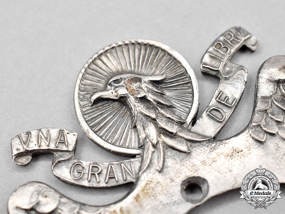 1. A frame featuring the national emblem of the Spanish State, constructed of silvered bronze, consisting of a Spanish national eagle with its head overlaying a halo and wings joined together by Falange symbols, in turn overlaying a banner bearing a national motto of “UNA, GRANDE, Y LIBRE” (“ONE, GREAT, AND FREE”), perforated with two holes for the attachment of rivets presumably formerly accommodating a national coat of arms, unmarked, measuring 42 mm (w) x 65 mm (h), in very fine condition.