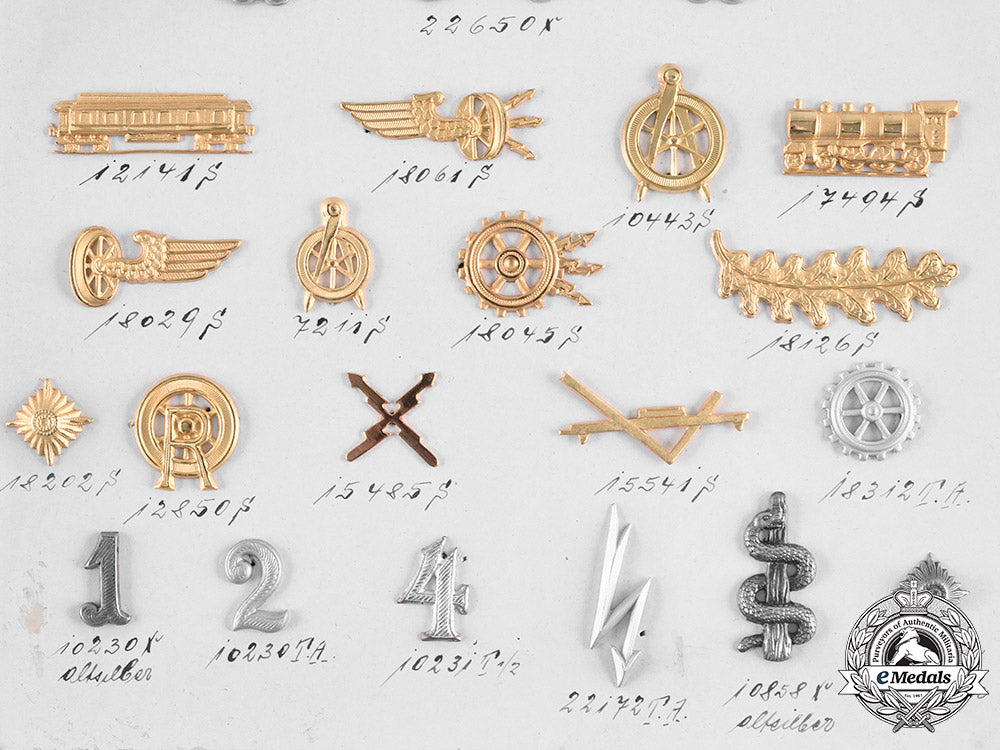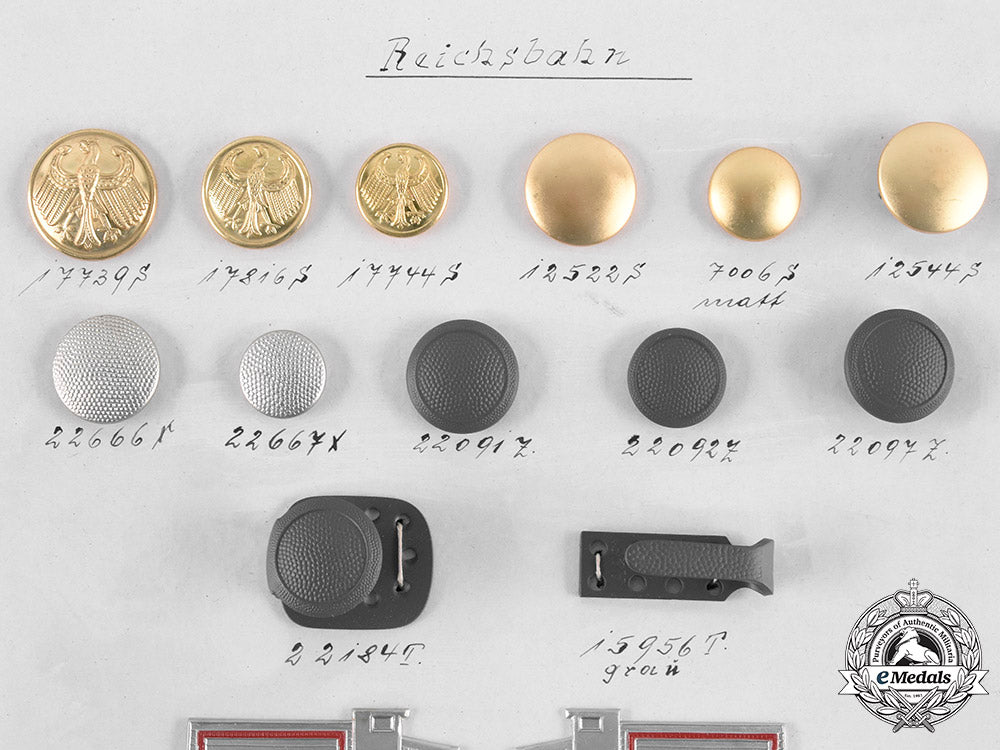 Three old style gilt buttons with raised eagle; three gilt Police buttons; two silvered buttons for drivers; three grey buttons; grey waist hook (Taillenhaken); grey side hook (Seitenhaken); old style silvered collar tab cyphers for drivers (22650X); old style gilt collar tab cypher for railcar inspectors (12141S); old style gilt collar tab cypher for engine car drivers (Triebwagenführer) (18061S); old style gilt collar tab cypher for railroad foremen (Bahnmeister) (10443S); old style gilt collar tab cypher for locomotive drivers (Lokomotivführer) (17494S); old style gilt collar tab cypher for conductors (Schaffner) (18029S); old style gilt collar tab cypher for railroad foremen (Bahnmeister) (7211S); old style gilt collar tab cypher for machinists (Maschinisten) (18045S); old style gilt collar tab cypher for administrative clerks (Verwaltungs-Beamte) (18126S); gilt rank pip; old style gilt collar tab cypher for shunters (Rangierer) (12850S); old style gilt collar tab cypher for line inspectors (Leitungsaufseher) (15485S); old style gilt collar tab cypher for rotte leaders (Rottenführer) (15541S); silvered cogwheel cypher; three silvered Arabic numerals; silvered lightning bolt cypher; silvered Asclepian Rod cypher; silvered rank pip.