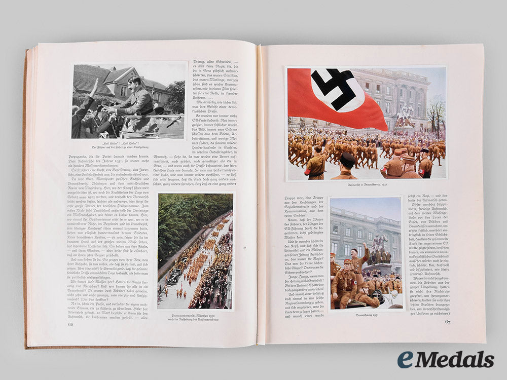 (Deutschland Erwacht). A 1933 edition of “Deutschland Erwacht: Werden, Kampf und Sieg der NSDAP” (“Germany Awakes: The Coming, Struggling, and Victory of the NSDAP”), constructed of a heavy card stock binding with a light brown canvas exterior, the exterior of the cover bearing an embossed mobile swastika within a circular oak leaf wreath, overlaid by a gilt Sturmabteilung stormtrooper in profile, above a gilt inscription of “DEUTSCHLAND ERWACHT” (“GERMAN AWAKES”) in Fraktur script, the interior of the cover retains a label bearing an inscription of “UNSER BUCH, ARTHUR UND GERTRUD SEYß-INQUART” (“OUR BOOK, ARTHUR AND GERTRUD SEYß-INQUART”) indicating that the book was retrieved from the personal library of SS-Obergruppenführer Arthur Seyss-Inquart, the interior features a glossed black-and-white photograph of the Führer, followed by 153 card stock pages featuring 225 pasted cigarette carton-style photographs in both colour and black-and-white, detailing the history of the rise of AH and the NSDAP, concluding with a large fold-out panorama of the 1933 Nuremberg Rally, published in 1933 by Cigaretten-Bilderdienst Altone-Bahrenfeld, measuring 240 mm (w) x 315 mm (h), while minor age-appropriate material fatigue is evident to the edges of the pages and some photos have slightly loosened, none are missing and the book is in an overall extremely fine condition.