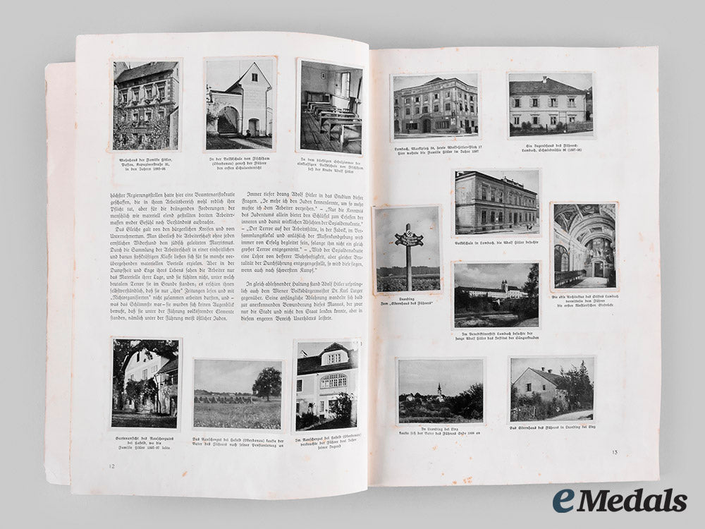 Wie die Ostmark ihre Befreiung erlebte: A.H. und sein Weg zu Großdeutschland, the cover bears a black and white photograph of A.H., underneath captioned in white “Am Balkon in Linz in der Nacht vom 12 zum 13 März 1938” on a green bordered, below in gilt ink is “ Wie die Ostmark ihre Befreiung erlebte: A.H. und sein Weg zu Großdeutschland” on a green background with mobile swastikas in the corners and topped with a centrally located national eagle clutching a wreathed mobile swastika in its talons, the back cover is green and the spine bears the title, the interior cover retains a label bearing an inscription of “UNSER BUCH, ARTHUR UND GERTRUD SEYß-INQUART” (“OUR BOOK, ARTHUR AND GERTRUD SEYß-INQUART”) indicating that the book was retrieved from the personal library of SS-Obergruppenführer Arthur Seyß-Inquart, black and white photographs are integrated throughout the book, minor scuffing and discolouration, measuring 230 mm (w) x 305 mm (h), very fine.