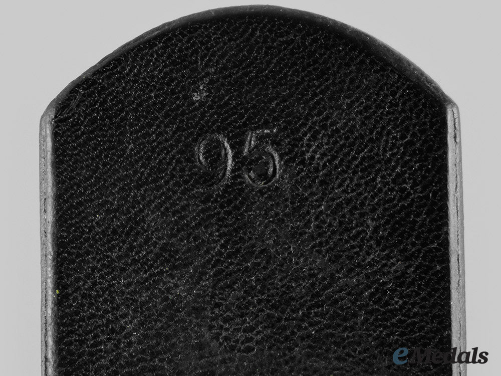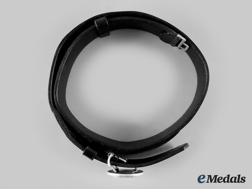 (SS Gürtel). An SS Officer’s belt and buckle, the former constructed of a black leather, the interior with seven dual holes for attachments, the opposite end with an integrated aluminum loop, with two leather loops, marked on the interior with “SS 502/ 39 RZM”, measuring 46 mm (w) x 1030 mm (h); accompanied by a buckle constructed of aluminum, the obverse with an eagle with outstretched wings holding a central wreathed swastika in its talons, the bottom bears a banner with the inscription “Meine Ehre Heißt Treue” (My Honour is Loyalty), the reverse is marked “SS RZM OCL 36/39” (indicative of maker Overhoff & Cie), with a flat hook for attachment and a bar with dual attachment prongs, measuring 49.44 mm, extremely fine.