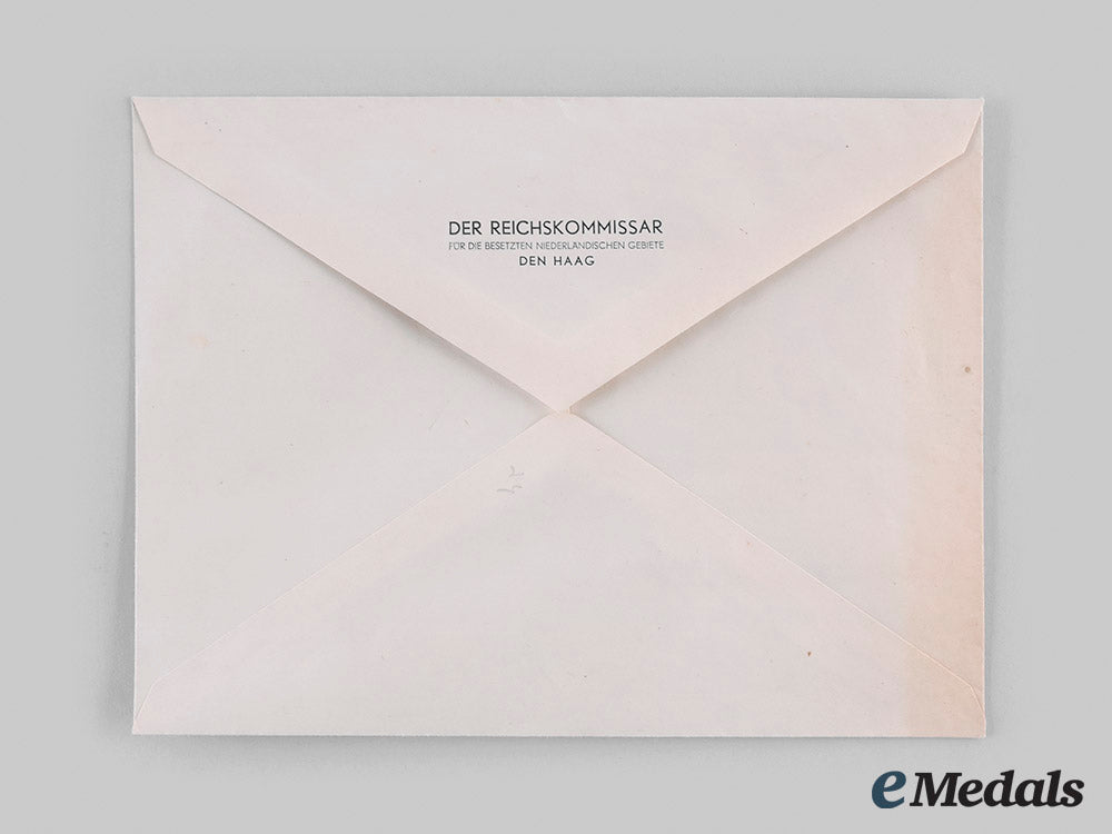 A press photograph of Arthur Seyß-Inquart greeting Hermann Göring in Vienna, with men in uniform in the background and a man taking a photograph, the reverse is stamped in green ink, with an attached paper in black ink explaining Hermann Göring’s reception in Vienna being greeting by Arthur Seyß-Inquart at the parliament building, measuring 178 mm (w) x 125 mm (h), slight scuffing at edges otherwise fine, in an envelope stamped “DER REICHSKOMMISSAR FUR DIE BESETZTEN NIEDERLÄNDISCHEN GEBIETE DEN HAAG”.