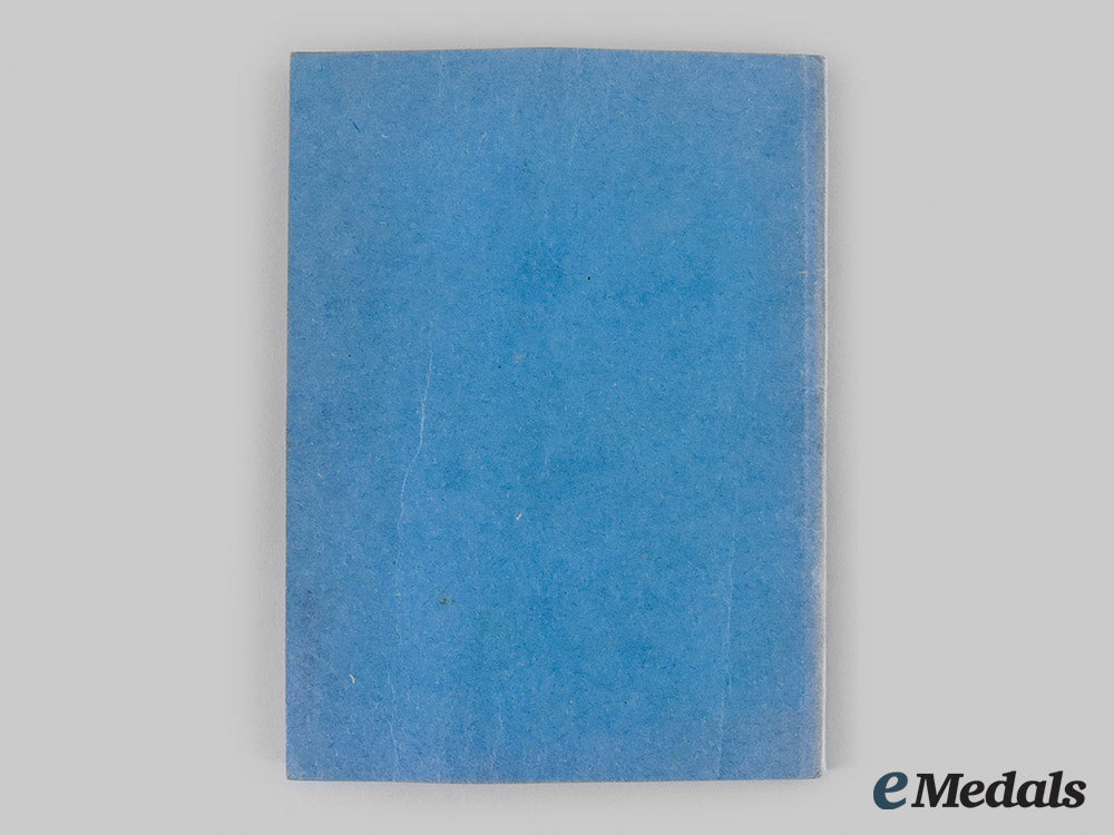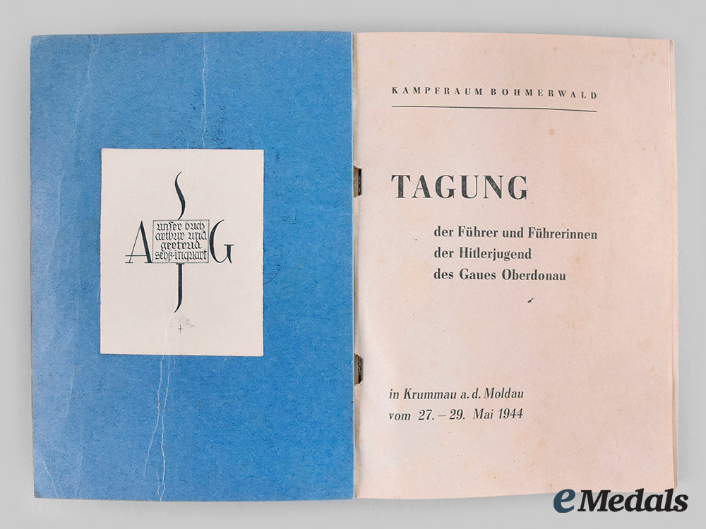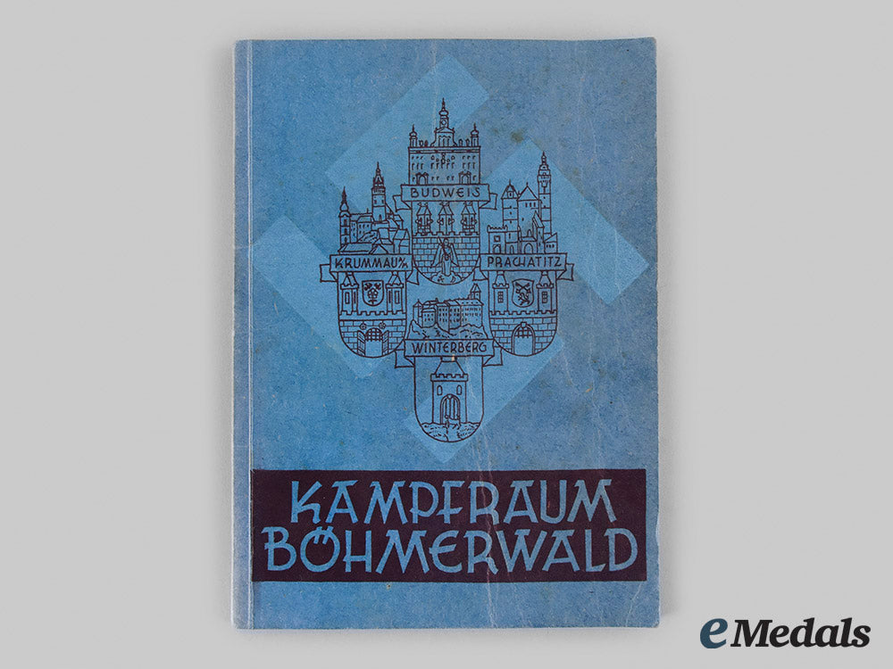 (Kampfraum Böhmerwald). A 1944 edition of “Kampfraum Böhmerwald”, constructed of a blue card stock binding, the exterior cover bearing conjoined coats of arms of Budweis, Prachatitz, Winterberg, and Krummau, overlaying a mobile swastika, above a black banner bearing an inscription of “KAMPFRAUM BÖHMERWALD”, the interior of the cover retains a label bearing an inscription of “UNSER BUCH, ARTHUR UND GERTRUD SEYß-INQUART” (“OUR BOOK, ARTHUR AND GERTRUD SEYß-INQUART”) indicating that the book was retrieved from the personal library of SS-Obergruppenführer Arthur Seyss-Inquart, the interior features 64 pages of black ink text presented with monochrome photographs, detailing the history of German inhabitants of Bohemia and issues pertaining to cultural and linguistic identity, published by Moldavia Publishing, Budweis, measuring 148 mm (w) x 202 mm (h), folding creases are evident to the cover and there is some age-appropriate material fatigue and soiling, in overall near extremely fine condition.
