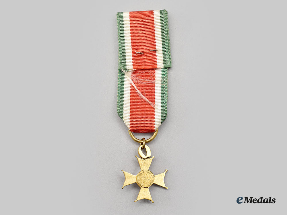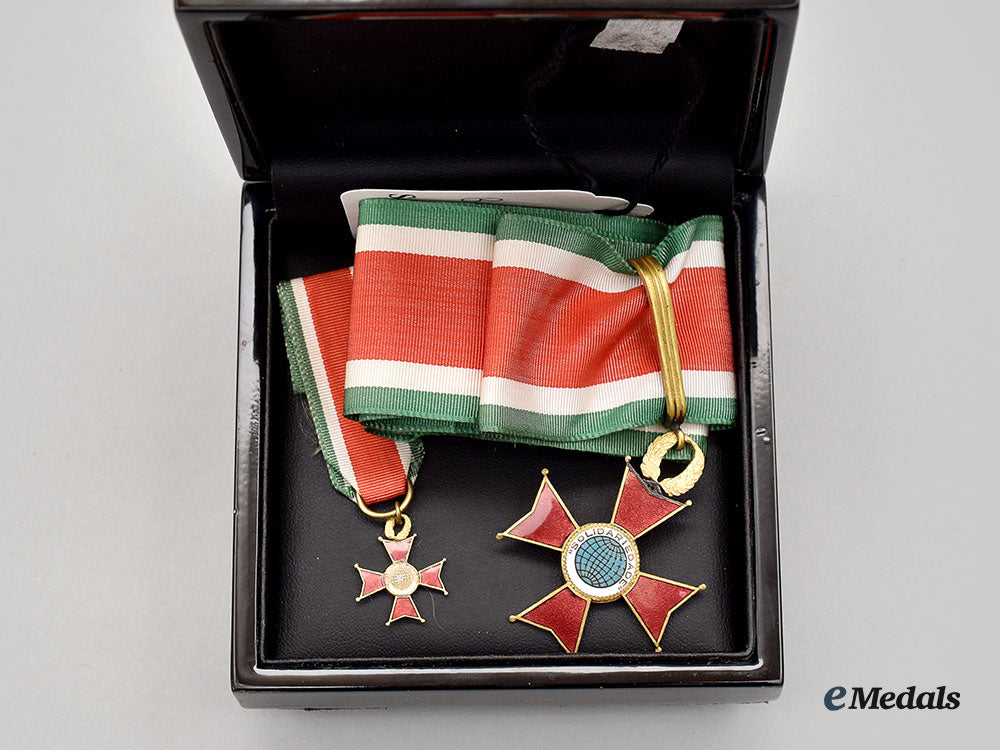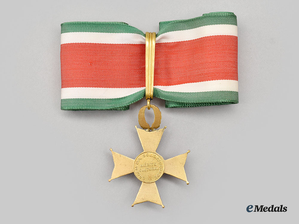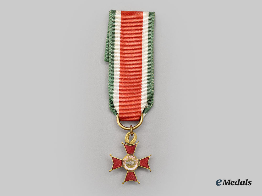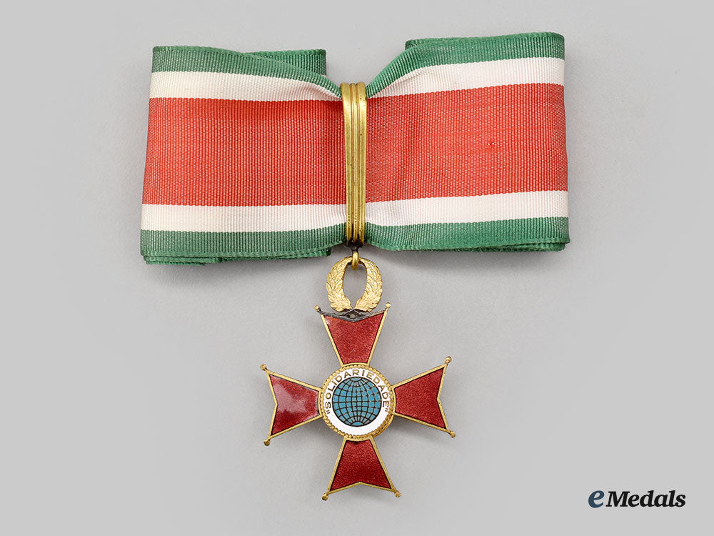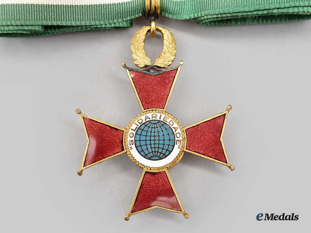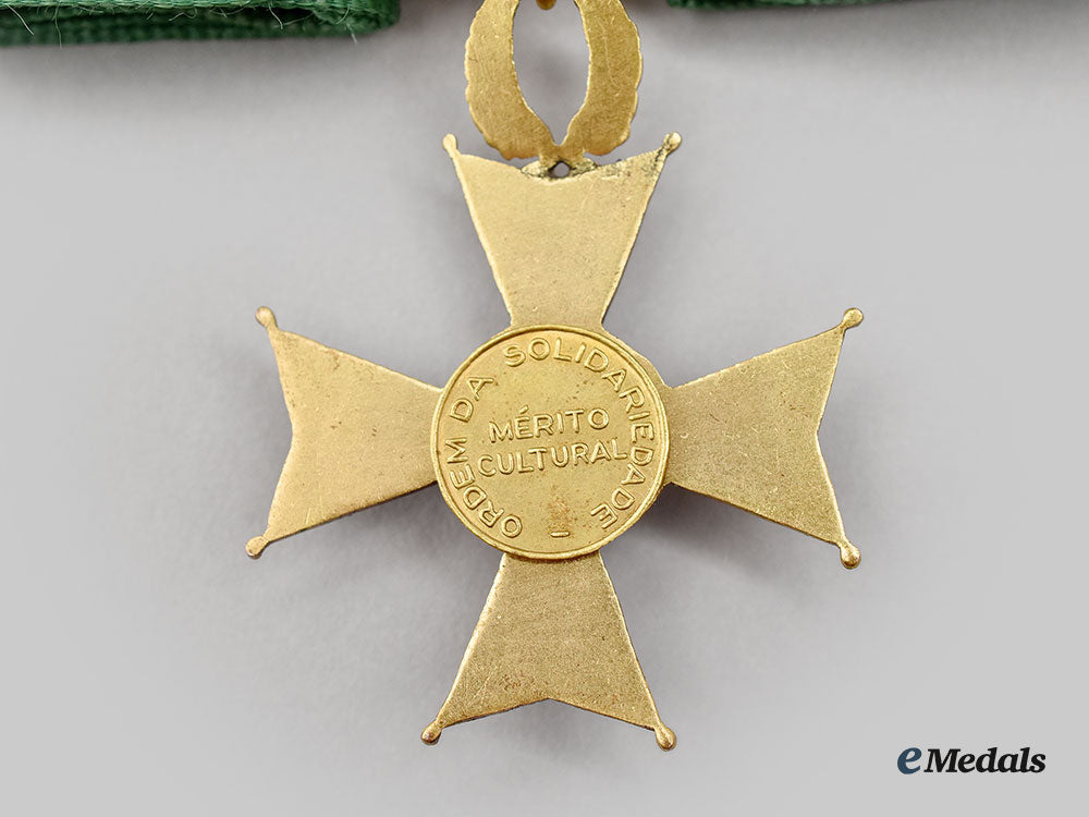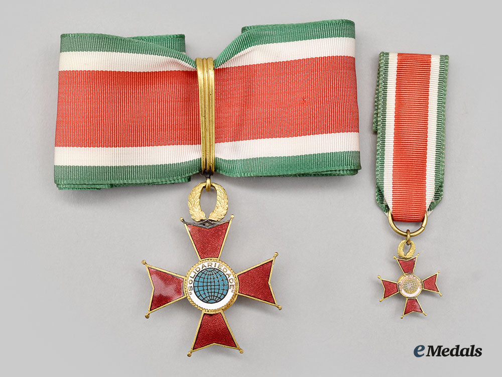 In gilt metal, a red enamelled Maltese cross with small ball finials, the obverse medallion features a blue globe with latitude and longitude with the inscription SOLIDARIEDADE, the reverse is plain with the central medallion featuring the inscription ORDEM DA SOLIDARIEDADE MERITO CULTURAL, the cross is surmounted by a small gilt wreath, measures 37.0mm (w) x 47.5mm (h), weighs 15.5 grams (including ribbon), worn on original silk red, white and green ribbon, wreath is slightly bent, enamel intact, areas of gilt wear, in very fine condition. Accompanied by a miniature of the order in gilt and enamels, measures 16.7mm (w) x 21mm (h) , light wear, in very fine condition.