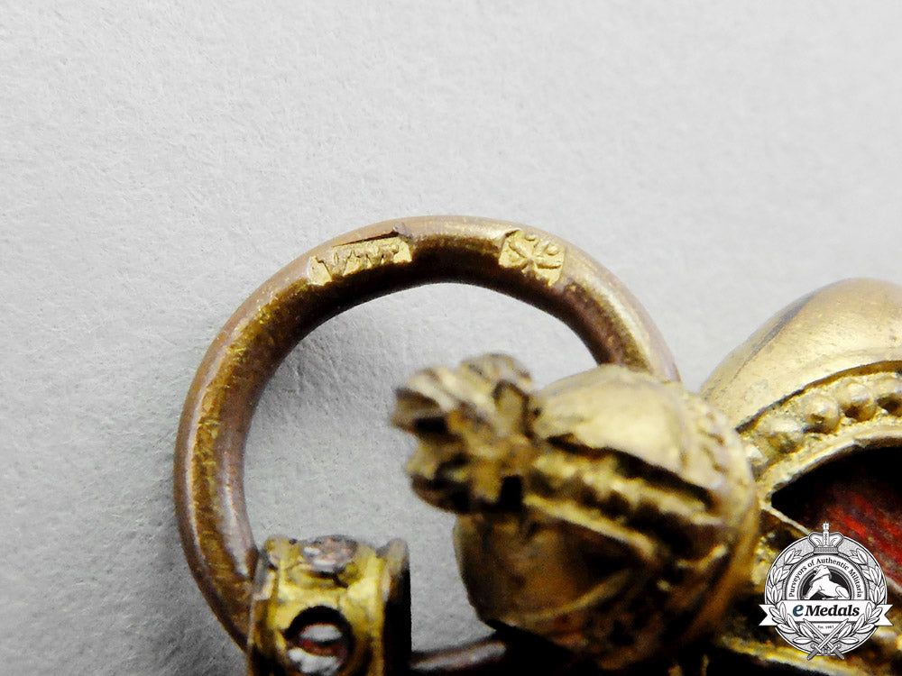 Austria; First War Period. Multi-piece construction, bronze gilt with red, green, white, blue and black enamels, maker marked "VM" (Vincent Mayer's Söhne) and marked with a five-pointed star denoting the award is constructed of bronze instead of gold, measuring 34.7 (w) mm x 67.5 mm (h) inclusive of its crown suspension, on a full-length neck ribbon, missing its iron insert in the base crown, chipping evident in the green enamels on the wreath on both sides, on two red enamelled diamond shapes on the obverse of the base crown and in the white enamelled beads on both sides of the loop, very fine.