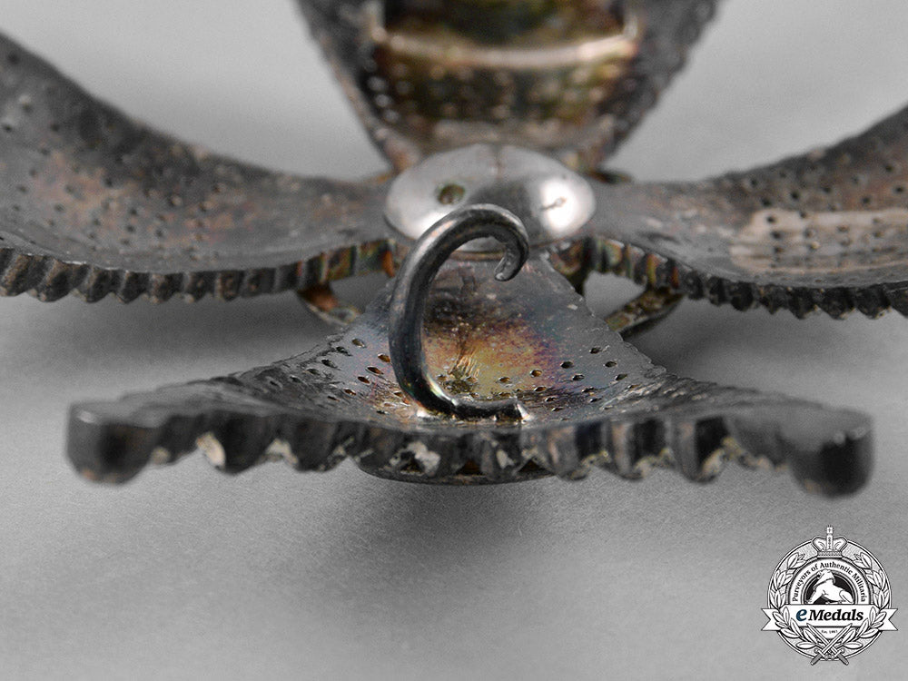 (Kungl. Vasaorden). Instituted in 1772. Type IV (1873-1919 Issue). In silver, each of the arms of the cross with ten rows of faceted rays, obverse centre with crowned stock, measuring 74.3 mm (w) x 73.5 mm (h), vertical pinback, scattered silvering wear on the insignia, heavily toned, near extremely fine.