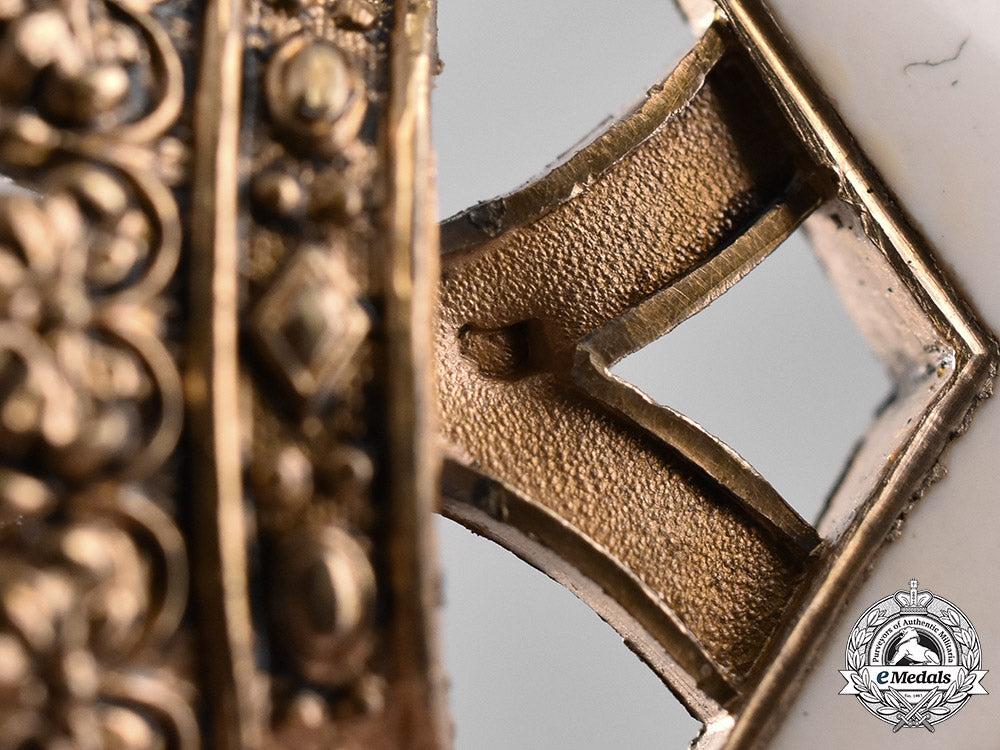 (Nordstjärneorden). Instituted 1748 by King Frederick I. Type II (1871-1919). In silver gilt, consisting of a white enameled Maltese Cross with ball finials, crowns in each quadrant with enameled jewels, obverse centre presenting a white enameled star on a blue background, Motto ""Nescit occasum"" (It knows no decline), reverse presents matching centre, with an ornate Royal crown suspension, hallmarked with boars head on integral suspension denoting French manufacture and silver content, without makers mark however exhibiting the manufacturing characteristics of Arthus Bertrand, measuring 39 mm (w) x 62 mm (h - inclusive of crown, horizontally pierced ball suspension adorned by cross), on period black silk ribbon, with enamel wear, fine.