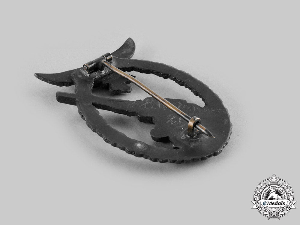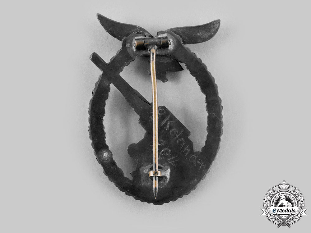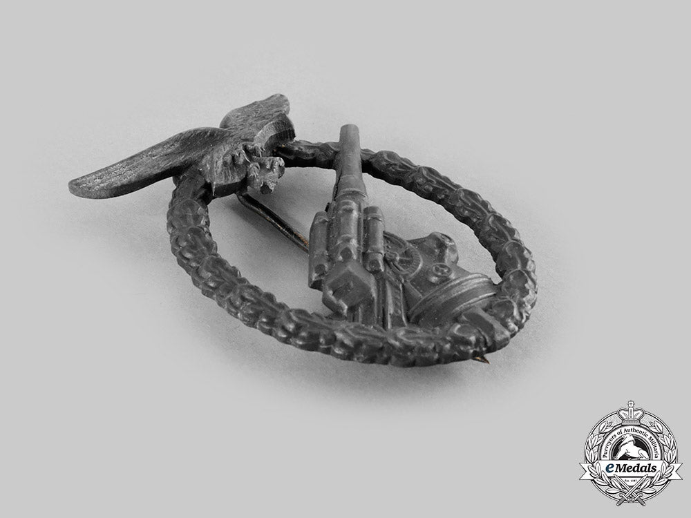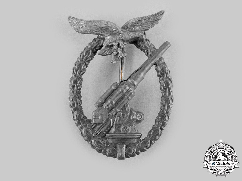 A Luftwaffe Flak Badge, constructed of zink, the obverse consisting of an oval oak leaf wreath, joined together at the bottom by ribbon, topped by a Luftwaffe eagle, with a central Flak 88 with its barrel raised and extending beyond the edge of the wreath, the reverse with a barrel hinge and vertical pinback meeting a flat wire catch, unmarked with the exception of a hand-etched name of “B. KOLANDER 284”, measuring 45.74 mm (w) x 63.95 mm (h), weighing 29.6 grams, the swastika formerly held in the eagle’s talons has been ground off and a crack is evident to the lower barrel of the Flak gun, in overall very fine condition.