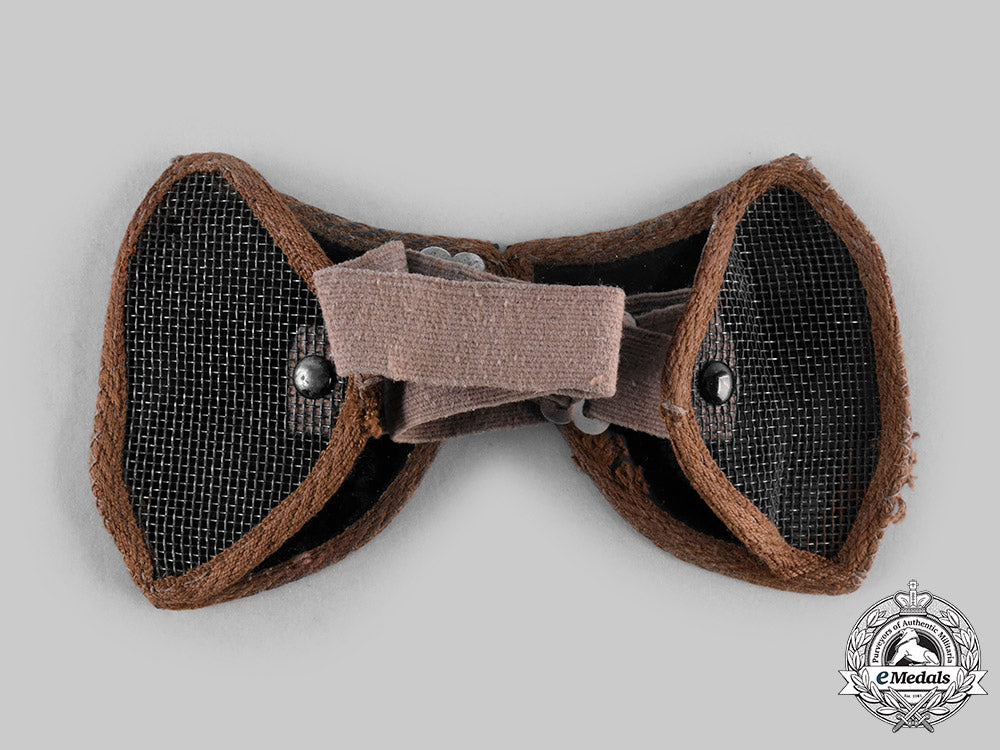 A set of Flak crew sun goggles, constructed of dark plastic eyepieces within brown cotton twill frames, the sides with magnetic metal mesh screens, with an elastic headband secured in place with dual magnetic metal rivets, adjusted with two magnetic metal buckles, unmarked, in overall near extremely fine condition.