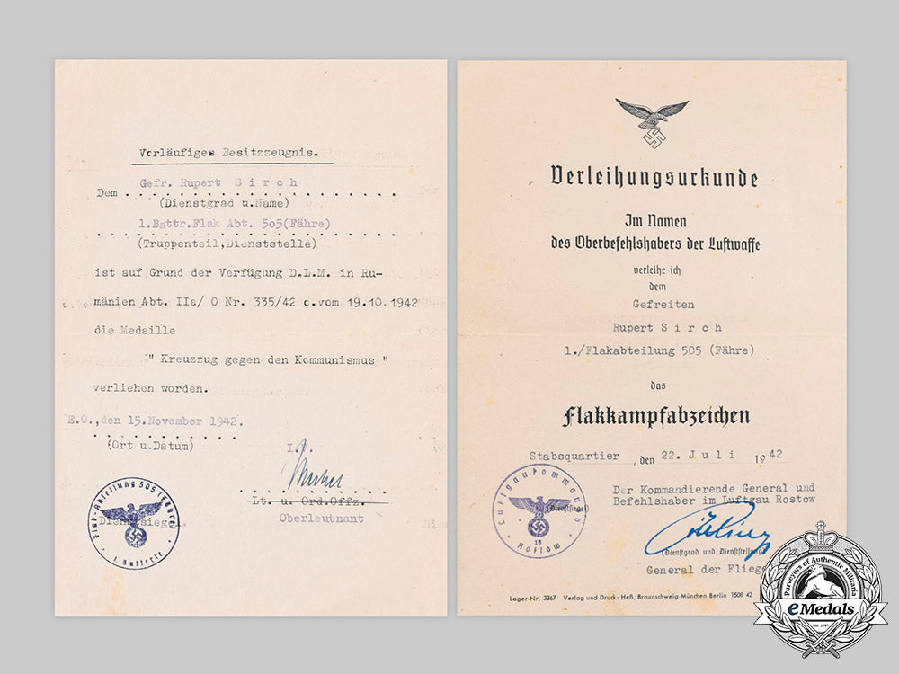 A Romanian Crusade Against Communism Medal certificate to Gefreiter Rupert Sirch of the 1st Battery of Flakabteilung (anti-aircraft detachment) 505 (Fähre) (ferry), dated to November 15, 1942. Measuring 150 mm (w) 211 mm (h), presenting a folding crease and minimal scuffing of the edges, remains extremely fine.
