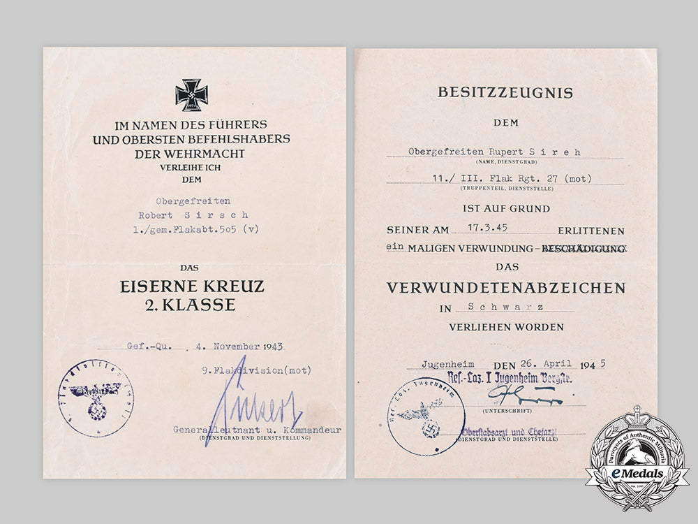 A Black Grade Wound Badge certificate to Obergefreiter Rupert Sirch (misspelled Rupert Sireh) of the 11th Battery of the 3rd Flak Regiment 27 (mot), dated to Jugenheim on April 26, 1945. Measuring 140 mm (w) x 201 mm (h), presenting a folding crease and light creasing of the edges, remains very fine.