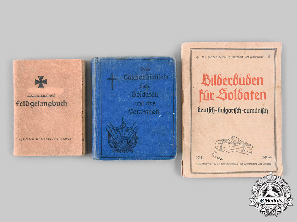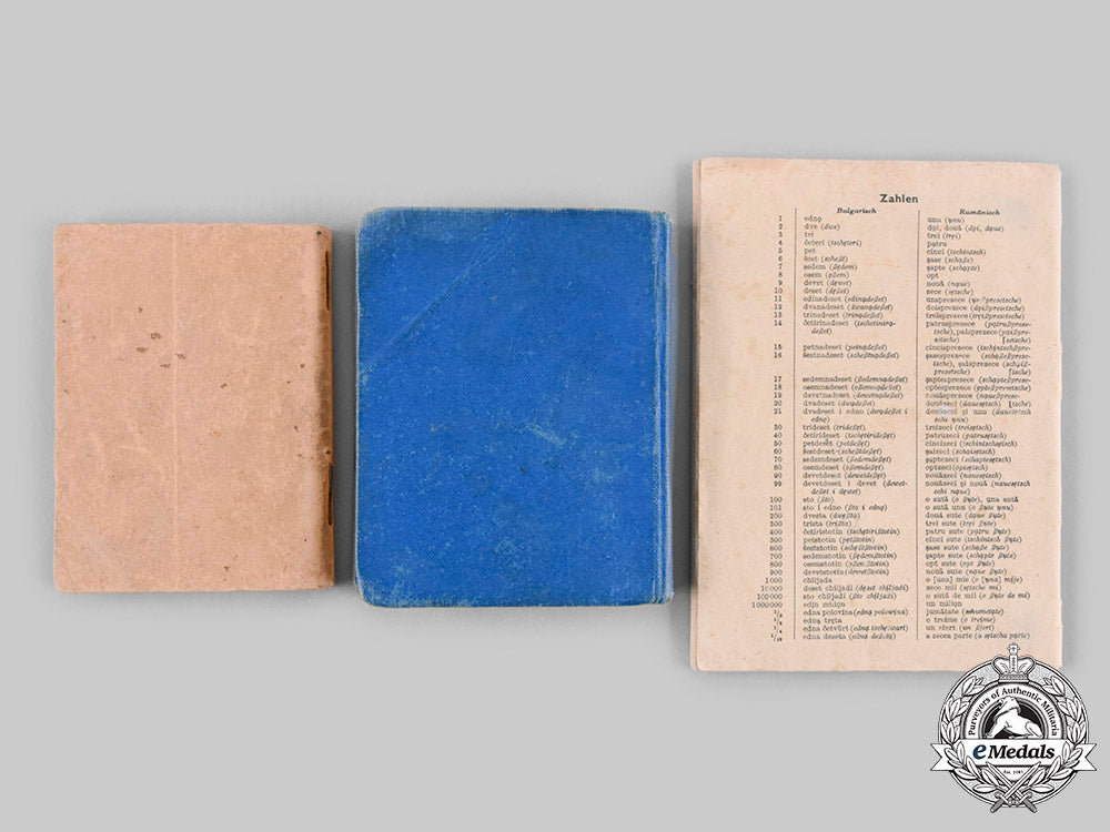 An official Wehrmacht soldier’s dictionary with pictures, German - Bulgarian - Romanian, dated to 1941, softcover, 64 pages, measuring 104 mm (w) x 144 mm (h), presenting light scuffing of the cover and light fraying of the spine, remains very fine.