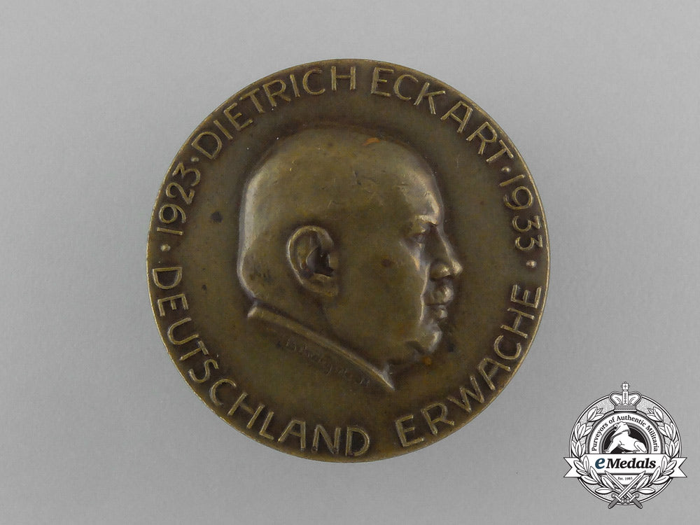 A 1933 Dietrich Eckart Deutschland Erwache badge; in gilded tombac; horizontal pinback; with the obverse depicting a rightward facing portrait by R. Schwegerle; maker marked “Deschler & Sohn, München” and marked “Neumarkt - birthplace of Dietrich Eckart) on the reverse; measuring 37 mm in diameter; very fine condition.
