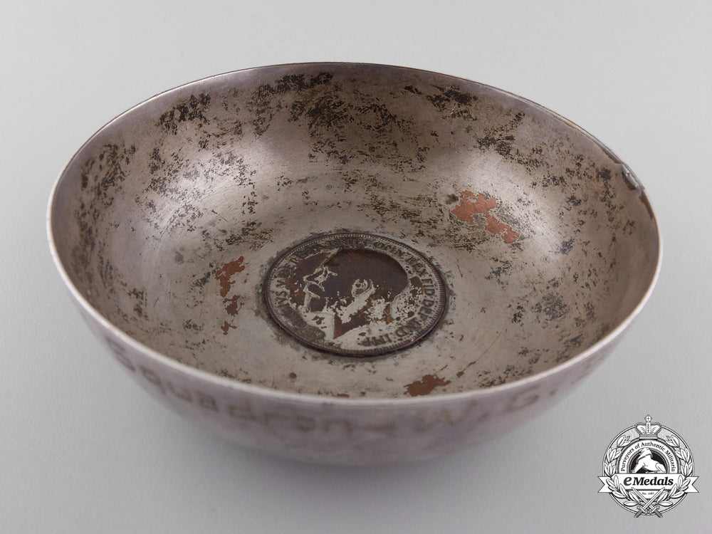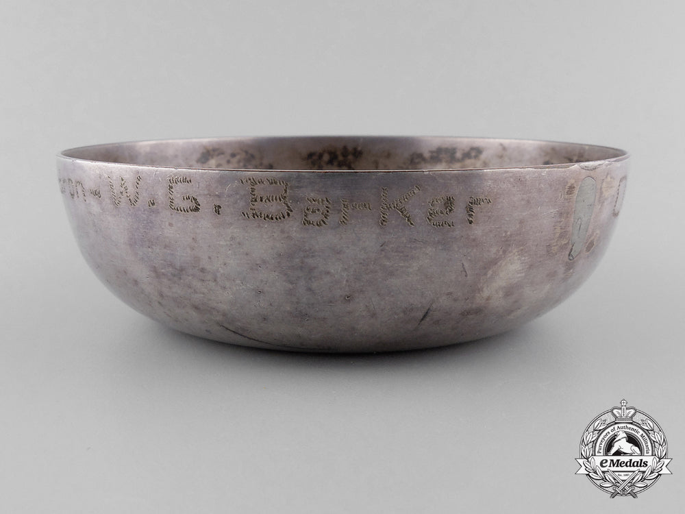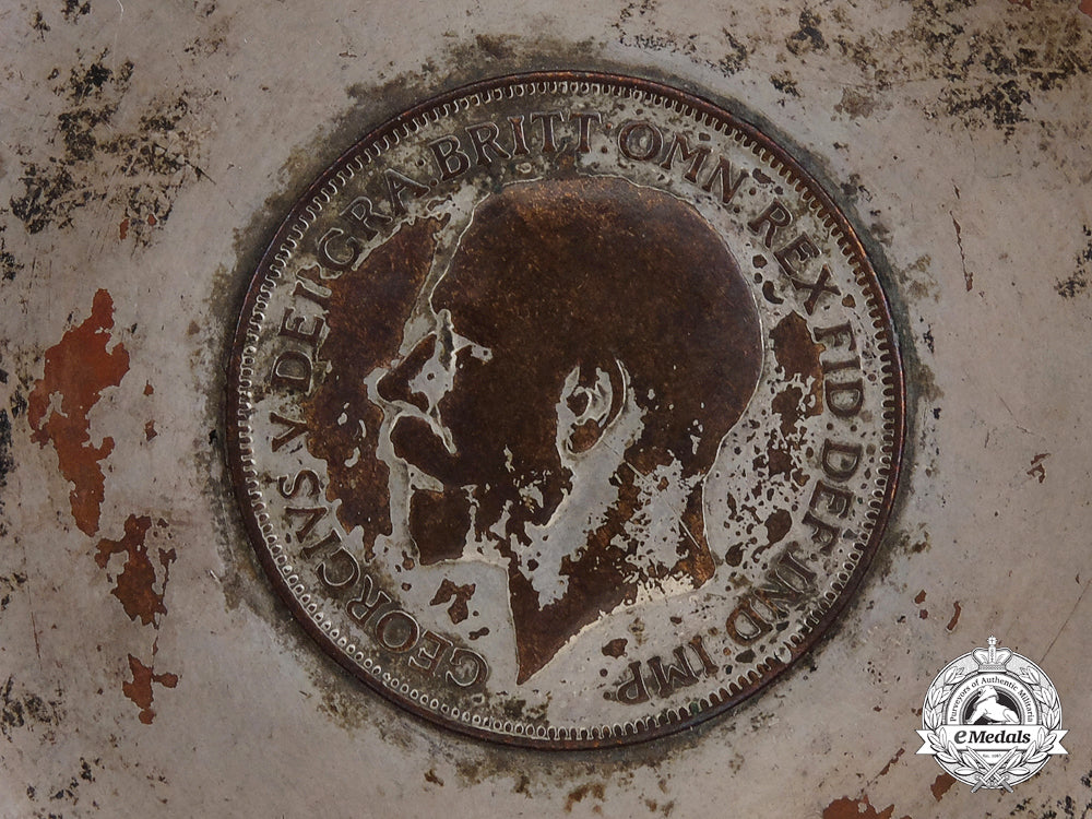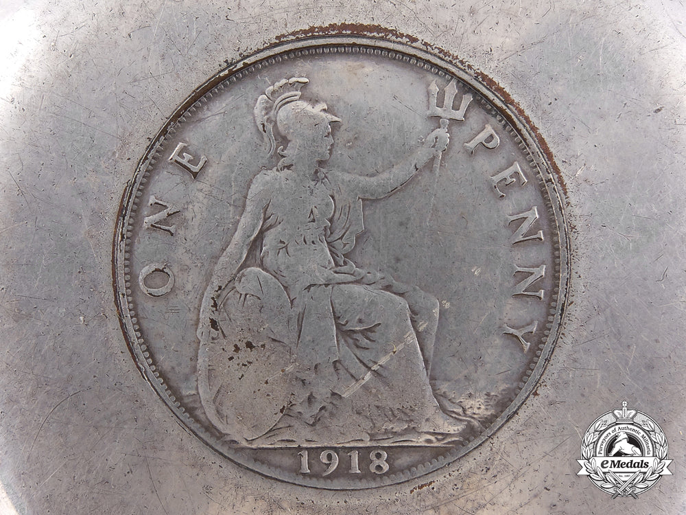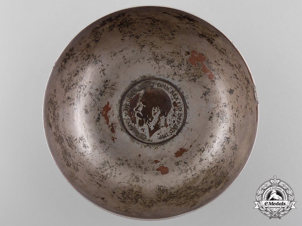 To the "the most decorated war hero in the history of Canada, the British Empire, and the Commonwealth of Nations": Silvered copper, with a silvered copper 1918 British One Penny coin embedded in the base, engraved "October 27, 1918 - France - R.F.C. No. 201 Squadron - W.G. Barker" below the rim on the exterior, 82.5 mm in diameter x 22.5 mm in height, contact marks and service wear, very fine. Accompanied by four Photographs of the Ashtray (black and white, gloss finish, 202 mm x 253 mm each), a Toronto Star Newspaper Article (dated Tuesday, September 20, 2011) and assorted research papers.
