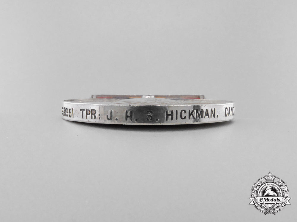 Footnote: James Henry Sylvester Hickman enlisted for service with the Canadian Scouts during the Boer War, naming his next-of-kin as his mother, Mrs. Margaret Hickman of Toronto, Ontario, stating that he was Single, that his religion was Protestant and his trade was that of Bookkeeper. Hickman was discharged from service at the Discharge Depot, South African Mounted Irregular Forces at Cape Town, South Africa, on May 13, 1902. He was awarded the Queen's South Africa Medal with four clasps: Cape Colony, Orange Free State, Transvaal and South Africa 1902.