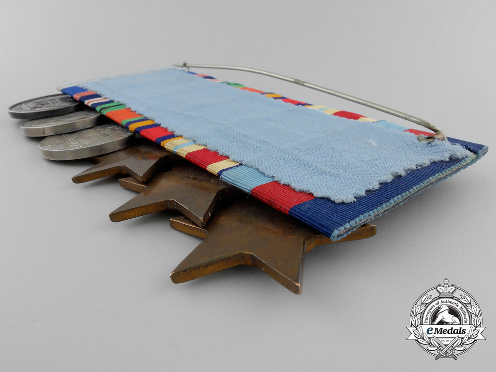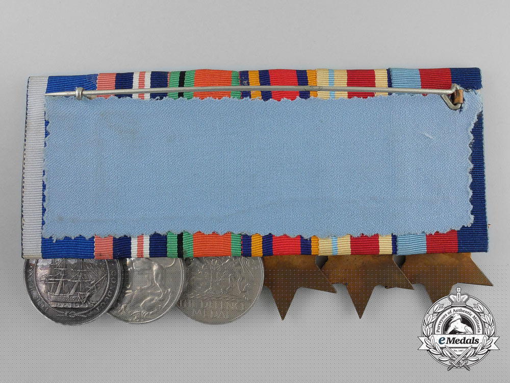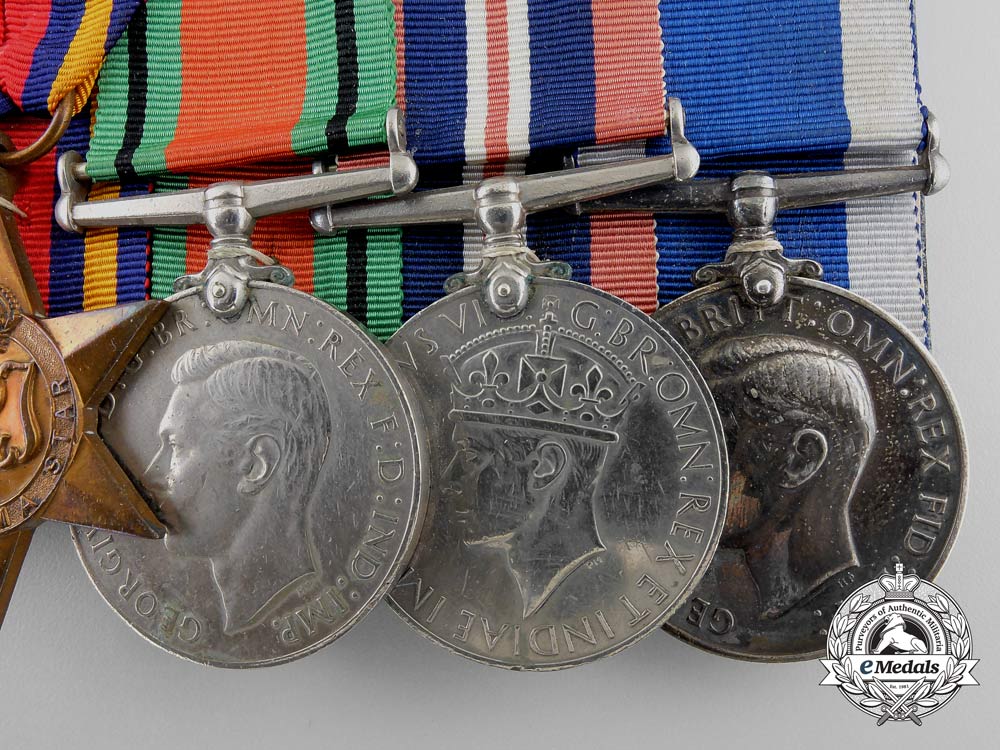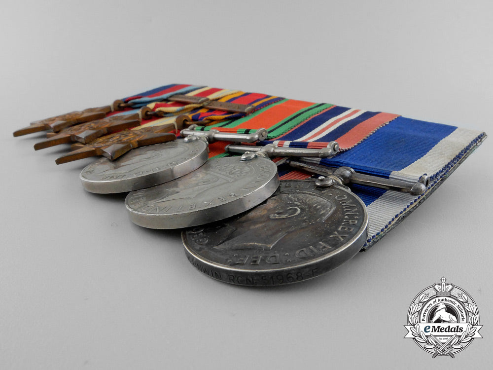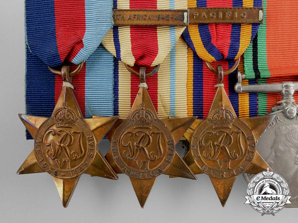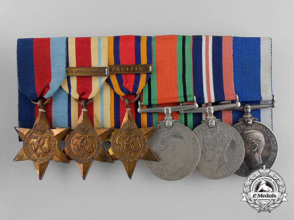 1939-1945 Star; Africa Star, 1 Clasp - NORTH AFRICA 1942-43; Burma Star, 1 Clasp - PACIFIC; Defence Medal; War Medal 1939-1945; and Royal Naval Long Service and Good Conduct Medal, George VI (CPO 1/c R.W. UNWIN RCN 51968-E). Naming is officially impressed on the RNLSGCM, the others are un-named. Court-mounted, original ribbons, very dark patina on the RNLSGCM, oxidation spot on the DM, light contact, near extremely fine. Accompanied by copies of his Winnipeg Light Infantry Attestation Paper, Naval Service Records, Record on Conviction, War Service Gratuity Computation of Service Form, Application for the Canadian Forces' Decoration and Death Certificate.