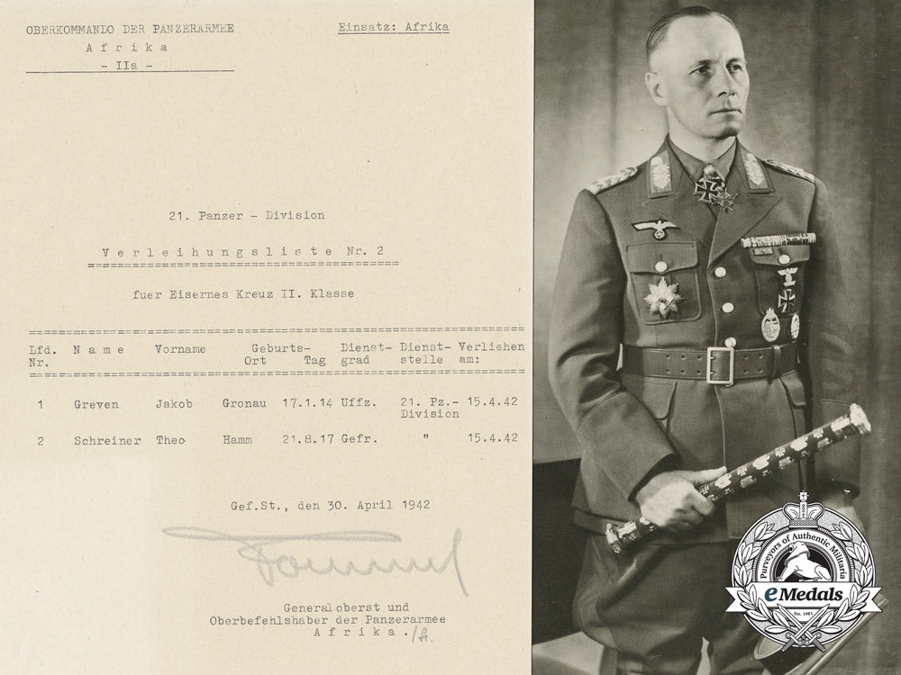 An Preliminary Award List Signed By Field Marshal Rommel 1942