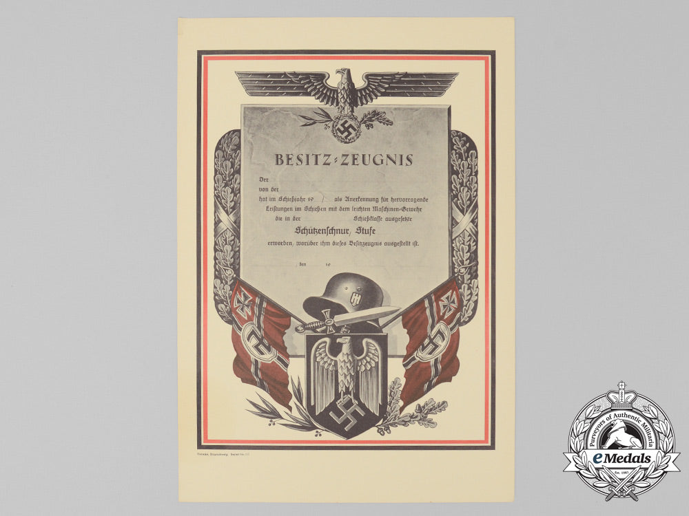 An Uncommon Mint German Machine-Gun Lanyard Marksmanship Award Document