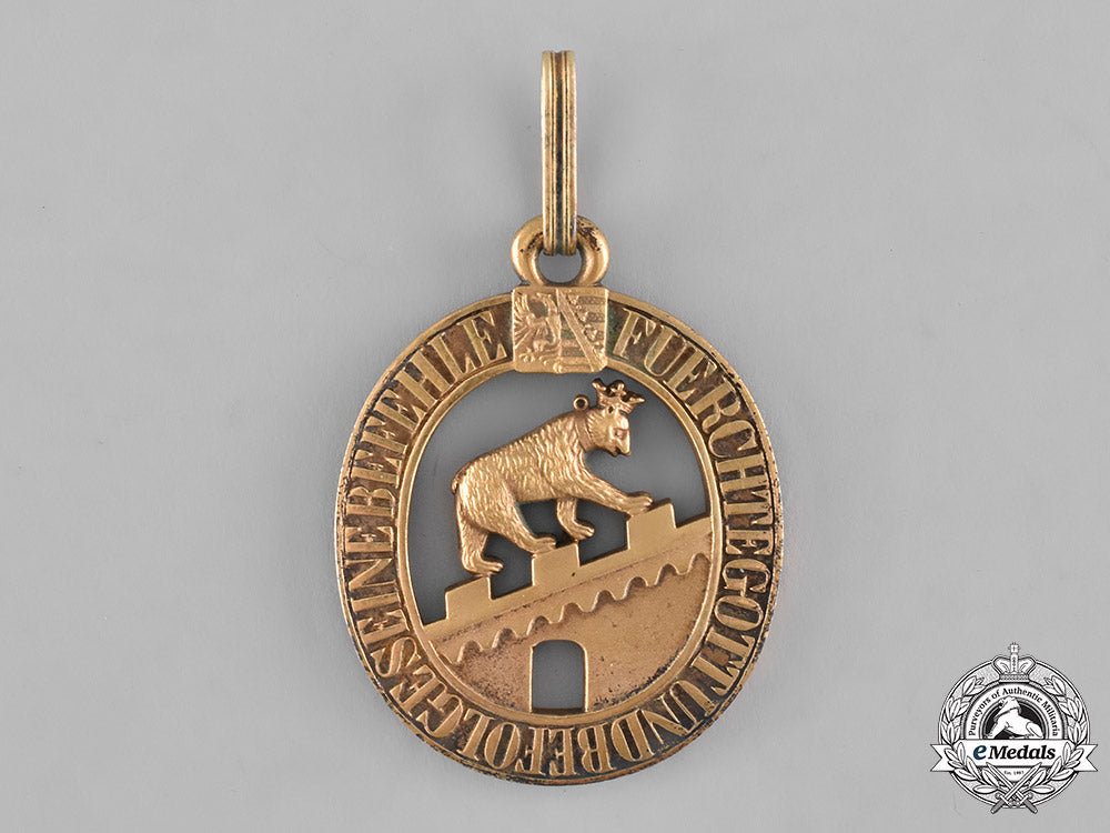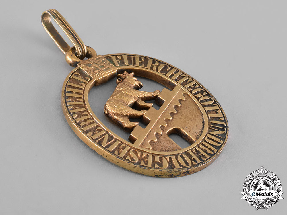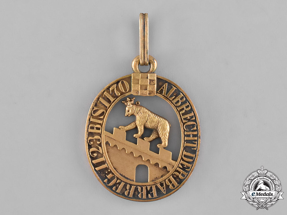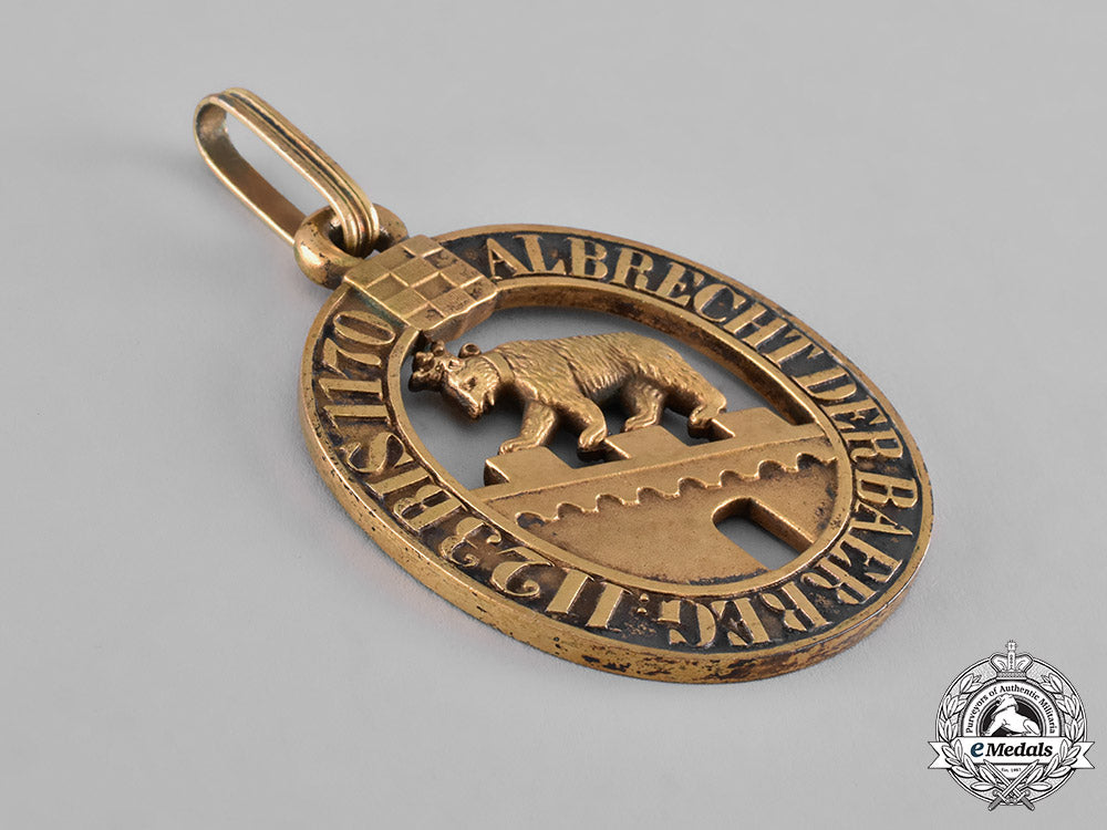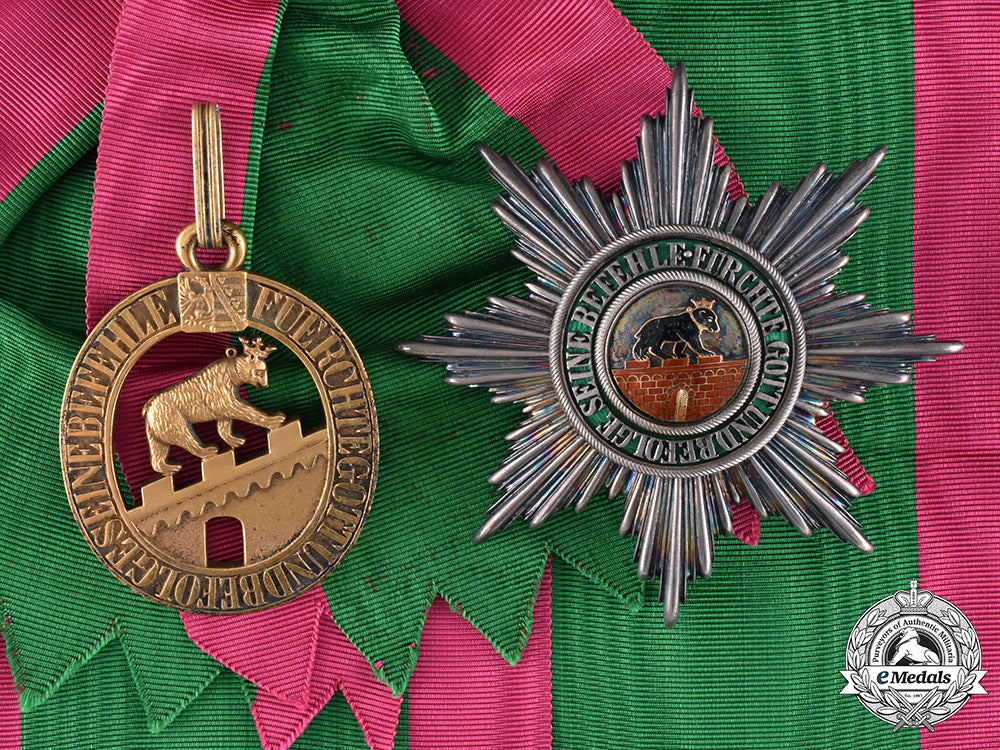(Hausorden Albrecht des Bären Großkreuz). Issued 1836-1918. The breast star in the shape of a eight-pointed multi-rayed star; the obverse with a slightly domed central silver medallion, with a black enameled crowned bear walking on-top of a red enameled fortress wall, surrounded by a green enameled ring, inscribed “Fürchte Gott und Befolge seine Befehle” (Fear God and Follow his Commands); the reverse plain with a vertical pinback and a functional hinge/catch assembly; measuring 84.86 mm (w) x 84.68 mm (h); weighing 77.4 grams. The sash badge constructed of bronze gilt; the obverse displaying a crowned bear walking on-top of a fortress wall, circumscribed “Fürchte Gott und Befolge seine Befehle” (Fear God and Follow his Commands); the reverse inscribed “Albrecht der BaerReg: 1123 bis 1170”; suspended from a double looped ring and its period original full-size sash ribbon; measuring 47.15 mm (w) x 60.24 mm (h); weighing 43.6 grams; in overall extremely fine condition.