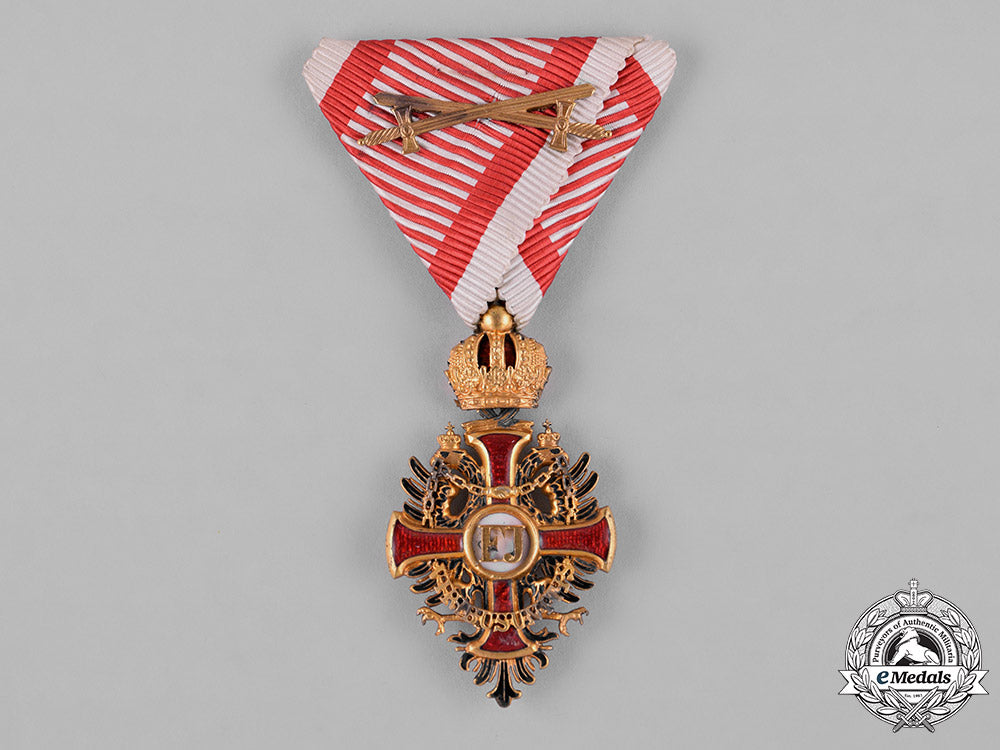 (Franz Joseph Orden Ritterkreuz, mit Schwertern). 1914-1918 Issue. A bronze gilt cross with double headed crowned eagle in silvered bronze, with a central white enameled medallion inscribed “FJ” in gold, along with chains and “Viribus Unitis” (Latin - United Strength) inscribed in gilt; the reverse of the cross with a a central white enameled medallion dated “1849,” with a swivel crown suspension and its period original tri-fold ribbon featuring crossed swords, maker marked on the ring for “V. MAYERS SÖHNE,” stamped with “IN WIEN,” stamped with five-pointed star hallmark denoting manufacture in bronze, measuring 31.19 mm (w) x 56.89 mm (h - inclusive of crown and horizontally pierced ball suspension, and in overall extremely fine condition.