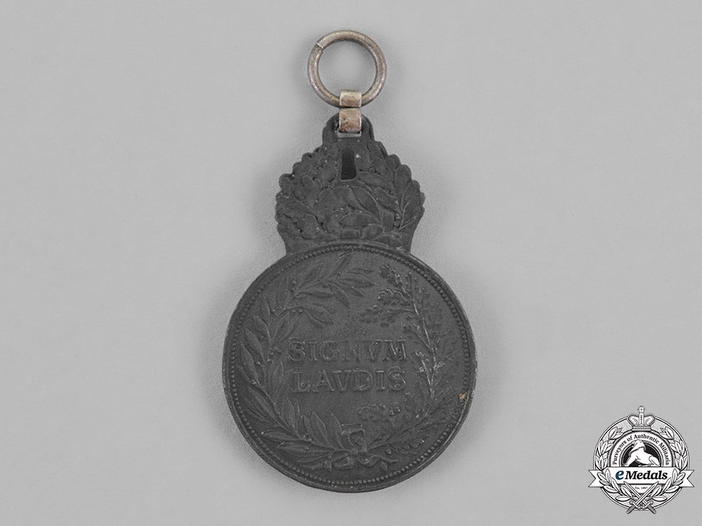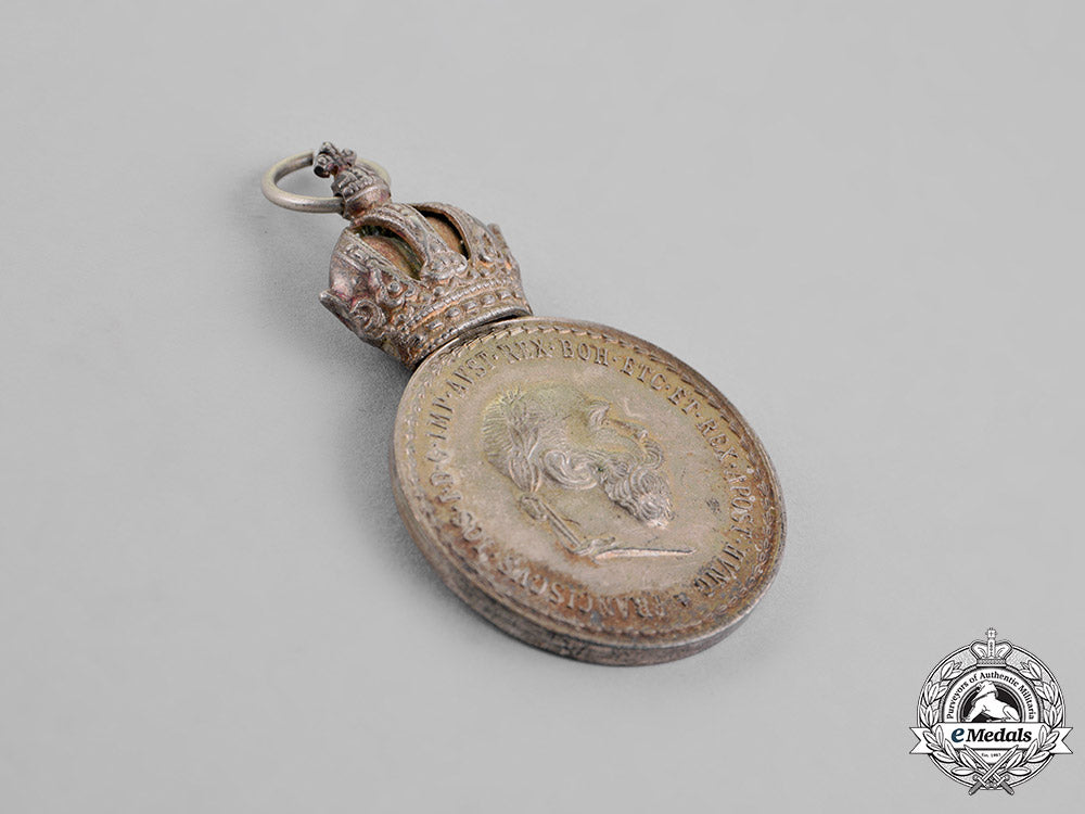 A grouping of four bravery medals and merit medals, consisting of 1) A Silver Merit Medal; consisting of a round silver medal, the obverse depicting the rightward facing bust of Kaiser Franz Josef, circumscribed by his name and title; the reverse inscribed “SIGNUM LAUDIS” (Latin - A sign of praise), within an open ended laurel and oak wreath; on a swivel crown suspension, with a replacement loop and a period original ribbon and a golden repetition clasp; measuring 32.10 mm in diameter and 52.96 mm in height including its crown; weighing 19.5 grams. 2) A Bronze Merit Medal; a round bronze medal; the obverse depicting the rightward facing bust of Kaiser Karl, circumscribed by his name and title, the reverse inscribed “FORTITUDINI” (Latin - Fortitude), within a laurel wreath; on a loop for suspension from its period original ribbon with incorrectly place triple repetition bars; measuring 31.12 mm in diameter. 3) A Gold Bravery Medal; a round gilded zink medal; the obverse depicting the rightward facing bust of Kaiser Karl, circumscribed by his name and title; the reverse inscribed “FORTITUDINI” (Latin - Fortitude) within a laurel wreath; on a loop for suspension without its ribbon; measuring 40.48 mm in diameter; weighing 17.2 grams, 4) A Silver Merit Medal; consisting of a round silvered zink medal; the obverse depicting the rightward facing bust of Kaiser Carl, circumscribed by his name and title; the reverse inscribed “SIGNUM LAUDIS” (Latin - A sign of praise), within an open ended laurel and oak wreath; on an attached crown for suspension, with a period original ribbon with crossed swords; measuring 30.70 mm (w) x 46.03 mm (h); weighing 15.5 grams; in overall near near very fine condition.