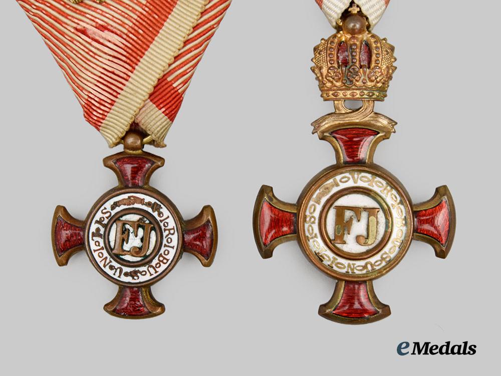 1. A Merit Cross “1849”. Constructed of gilded bronze with red enamels, consisting of a Ruppert Cross with red enameled arms, the obverse with a central medallion bearing a central gilt monogram of Franz Joseph I, circumscribed by an inscription of “Viribus Unitis” (United Forces) in capitalized Latin, the reverse with a central medallion bearing the institution year of “1849”, on an affixed loop and swivel ring for suspension from its period original tri-fold ribbon with crossed swords, marked “K. Böhm, Wien”, measuring 36.1 mm (w) x 56.8 mm (l), weighing 14.08 grams, the central roundel piece is loose and prone to falling out, in better than fine condition.