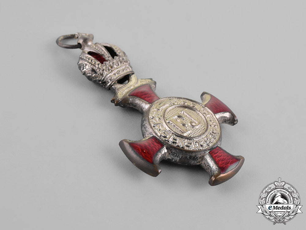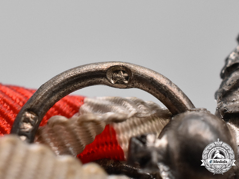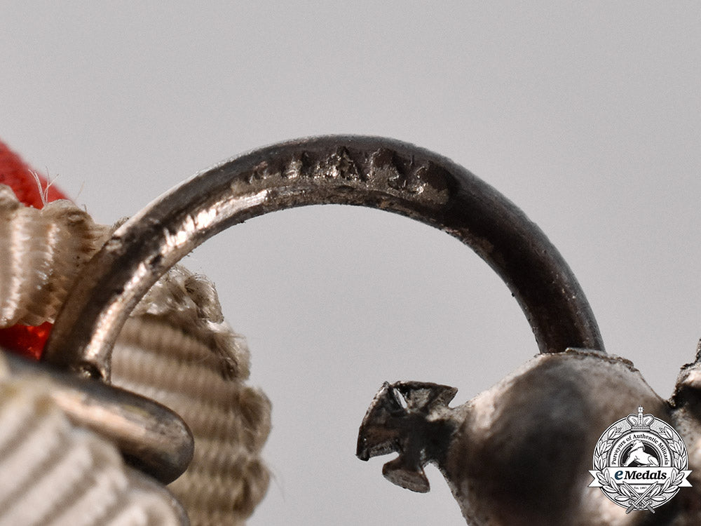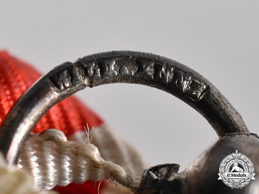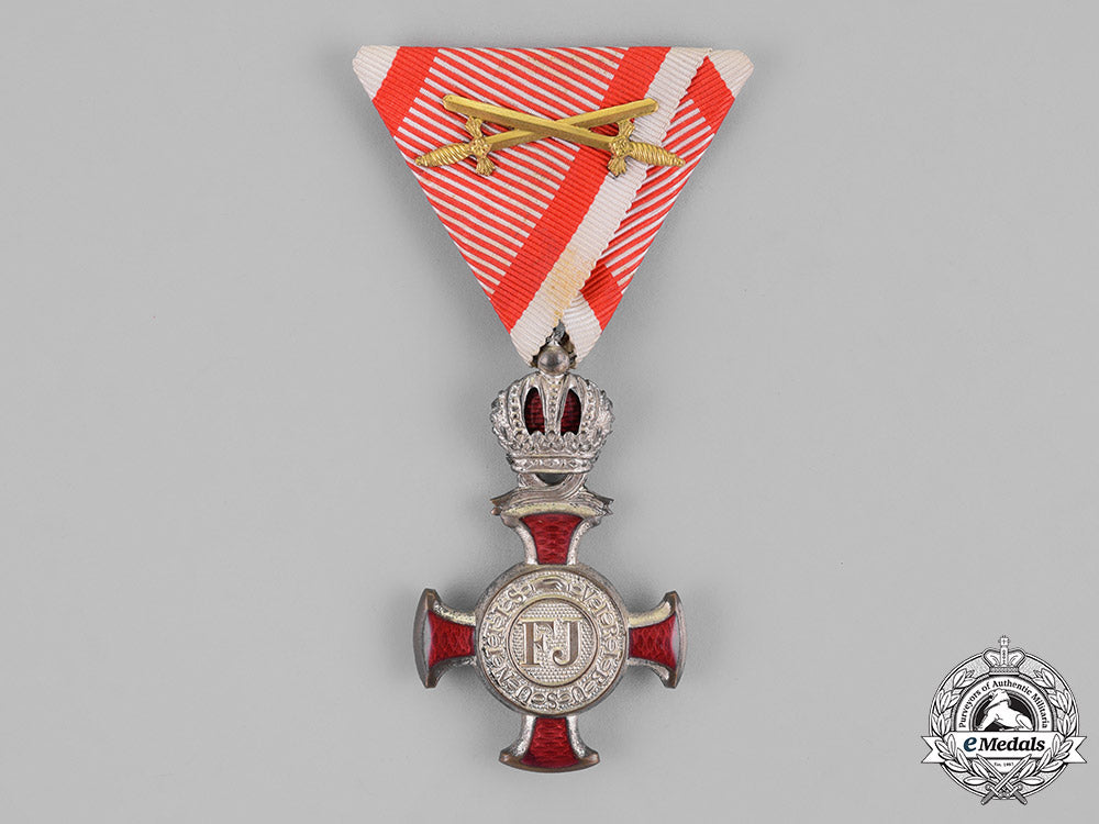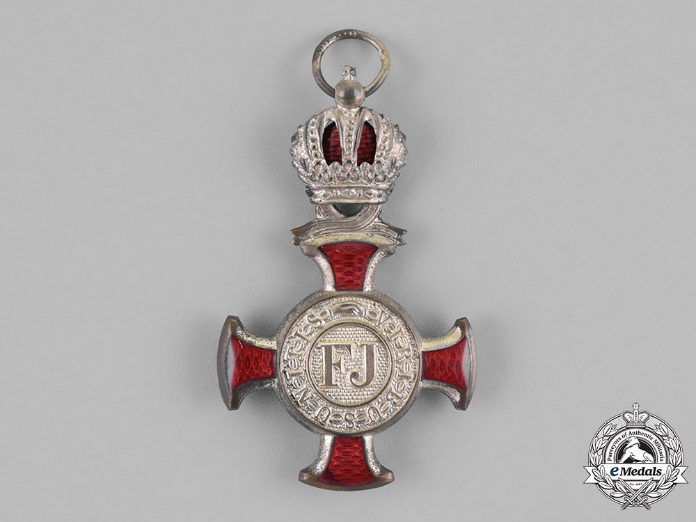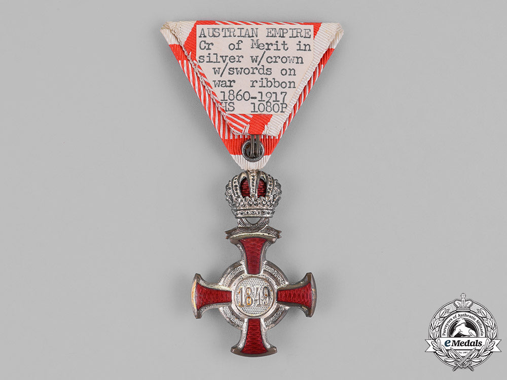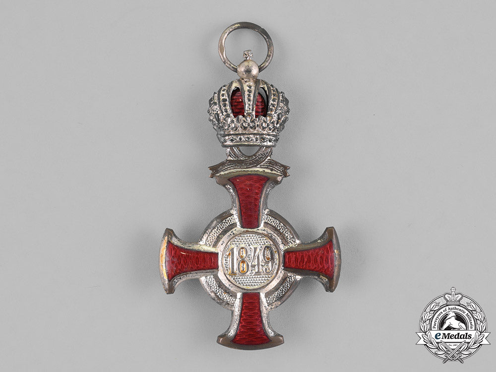 (Verdienstkreuz “1849” 4. Klasse). Third Period - Issued 1914-1918. A cross constructed of silvered bronze with red enameled arms; the obverse with a central silver medallion inscribed “FJ” for “Franz Joseph”, surrounded by a broad silver ring, inscribed “VIRIBUS UNITIS” (Latin - Stand United); the reverse with a similar central silver medallion dated “1849”; on a swivel crown and loop for suspension; the loop marked “Wilhelm Kunz, Wien” along with a star; suspended from its period original ribbon with crossed swords; measuring 36.44 mm (w) x 59.49 mm (h); weighing 15.5 grams; with some of its original silver finish worn off, in overall better than fine condition.