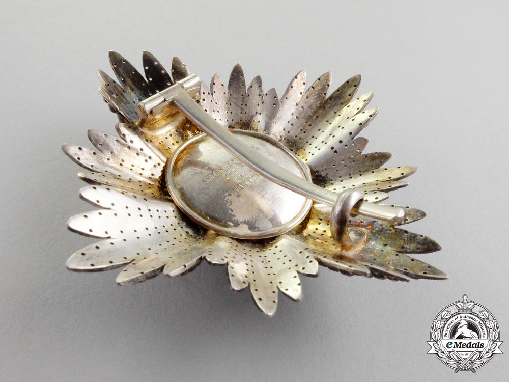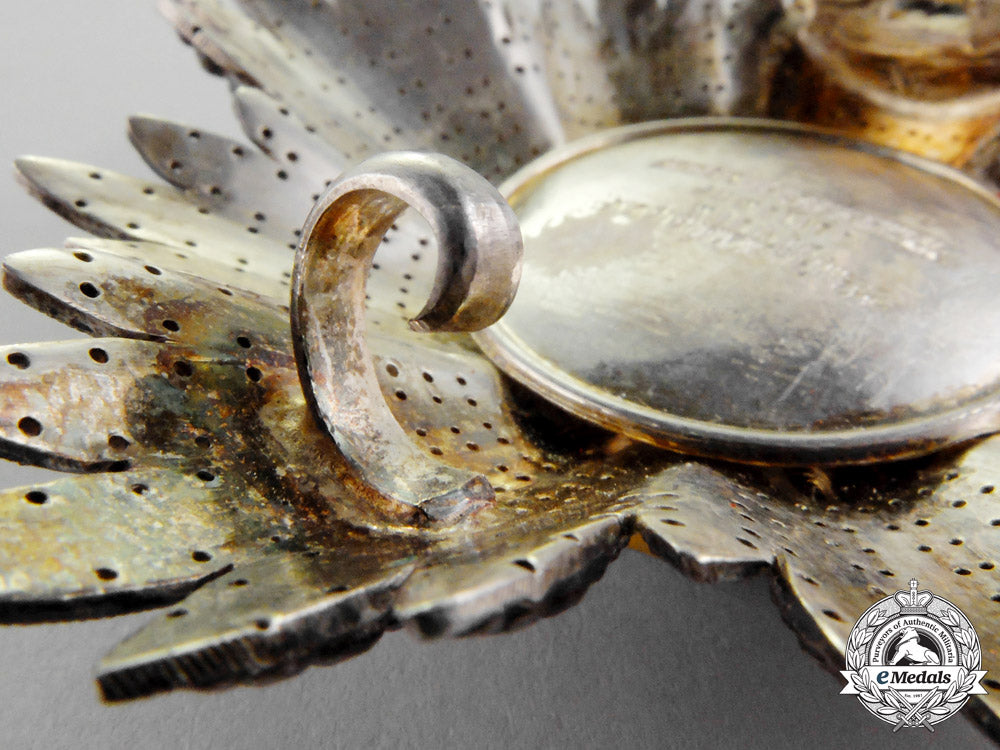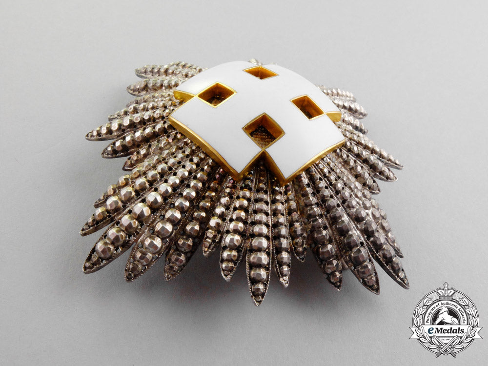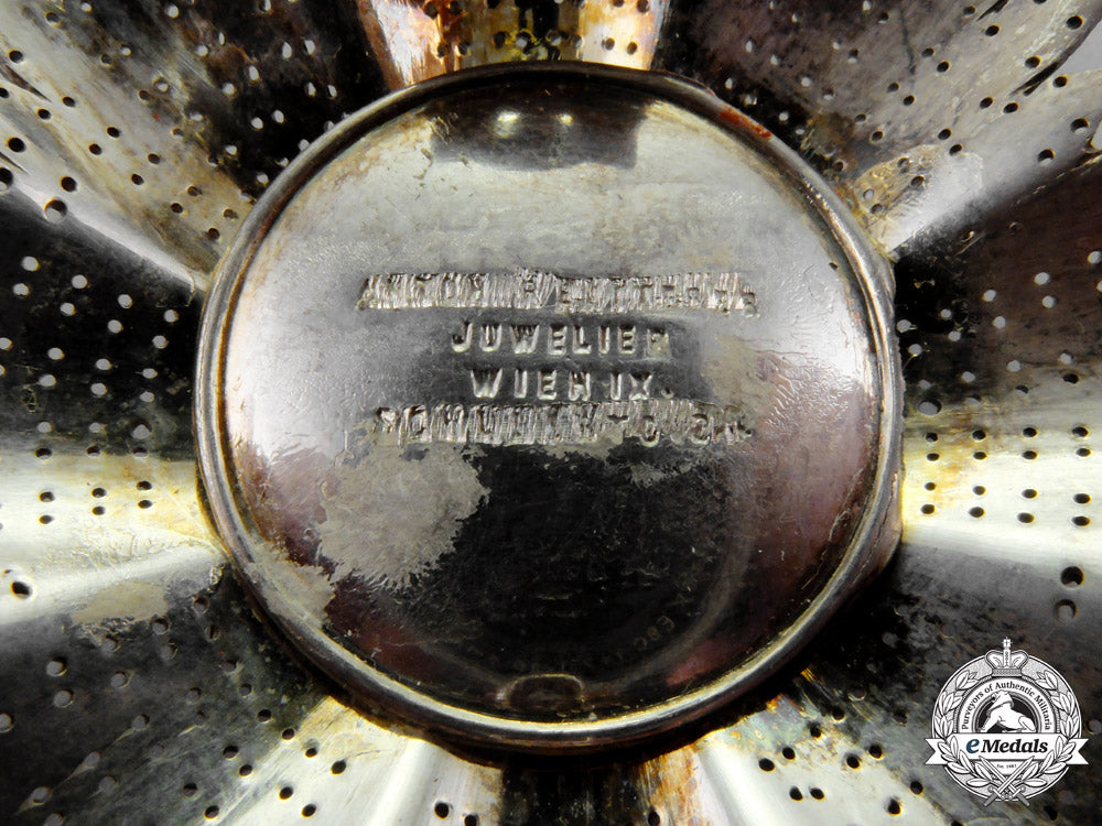 c.1925. Type I. An extremely fine quality manufacture issue Austrian 1st Republic (1918-1933) Order of Merit Commander Cross First Class; a silver 40-pointed breast star with a white enameled Seipel’s cross in silver gilt rimmed casing; the obverse with fine quality enamels; the reverse with a vertical pin and a functional hinge/catch assembly; the center medallion on the reverse marked Anton Reitterer Juwelier Wien IX Schubertg 24, however partially erased via hand etching, measuring 77.04 mm (w) x 77.16 mm (h); weighing 63.4 grams; near extremely fine.