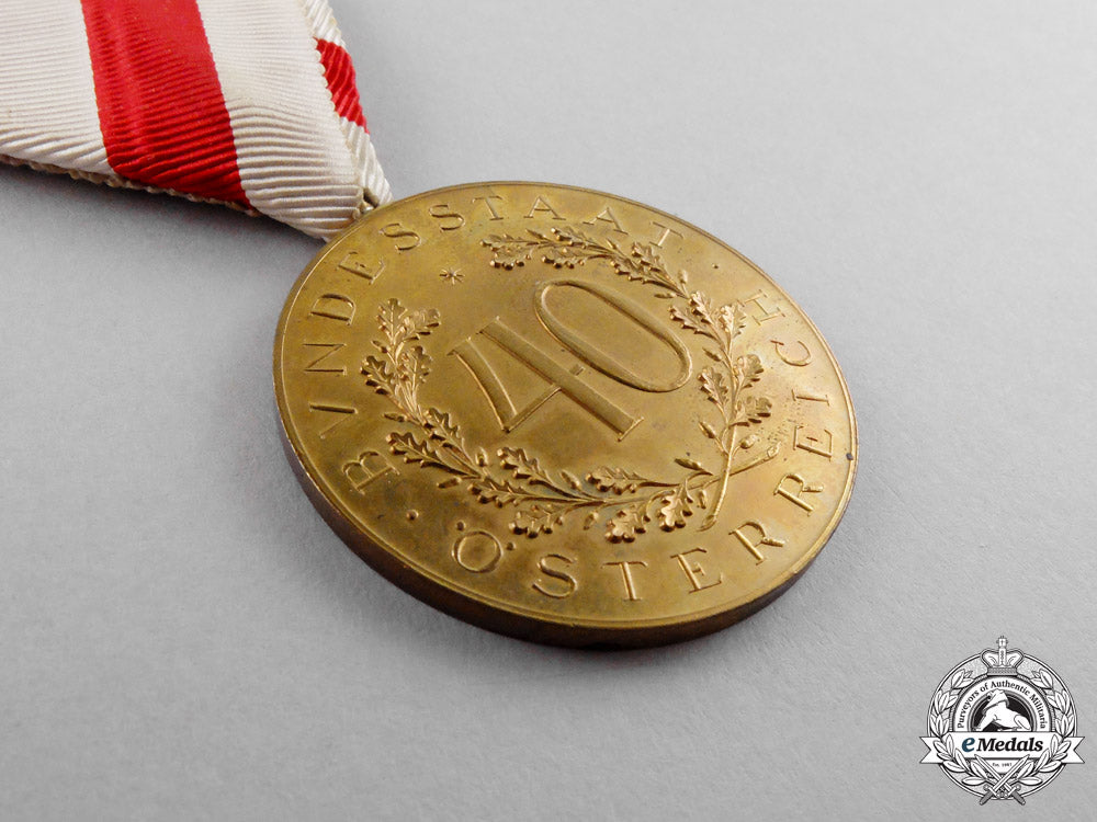 1) A “Federal State Austria” 40-Year long service medal; c. 1934-1938; in bronze; on loop for suspension; measuring 40.12 mm in diameter; weighing 26.3 grams.