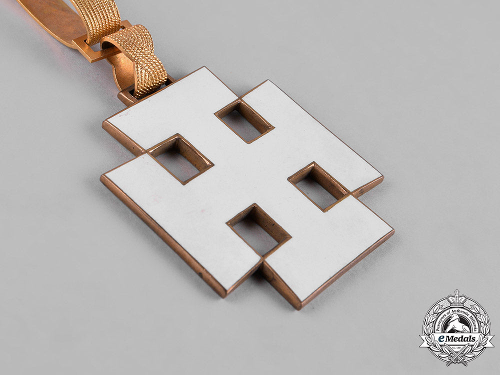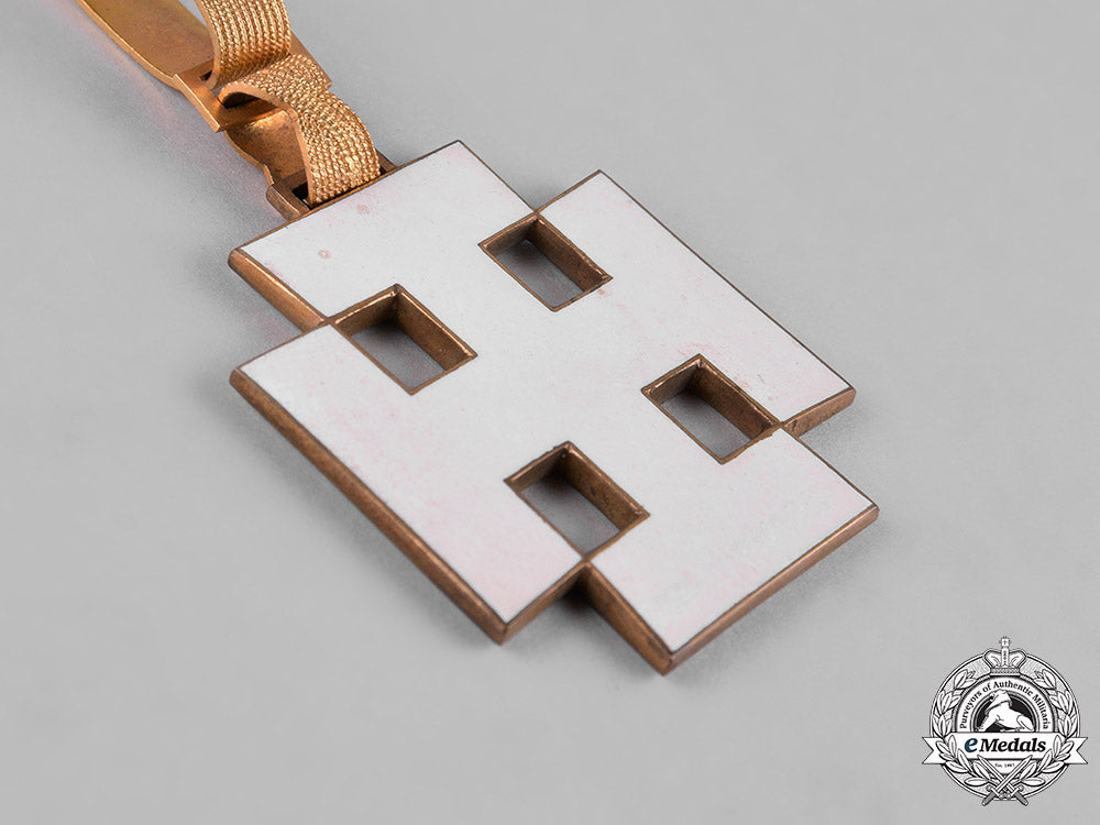 (Ehrenzeichen für die Verdienste um die Republik Österreich, Komturkreuz). Instituted 4 November 1922. (1922-1938 issue). Constructed of gilded bronze with enamels, consisting of a Crutch Cross with white enameled arms, with loops for suspension from period original neck ribbon, exhibiting the manufacturing characteristics of Anton Reitterer, measuring 40.51 mm (w) x 47.41 mm (h), weighing 32.6 grams, minor flecking of enamels, otherwise in near extremely fine condition.