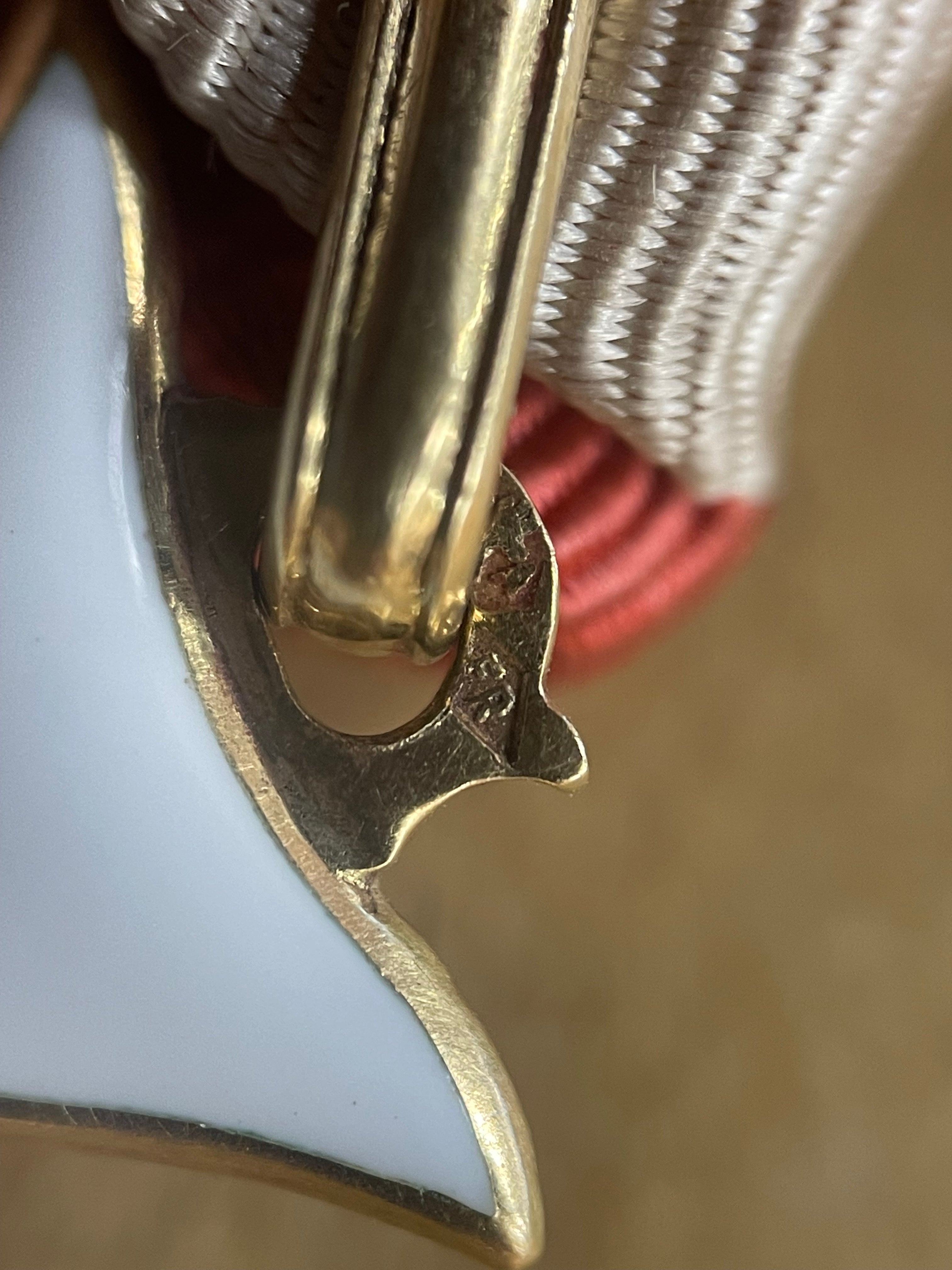 (Militär Maria Theresien Orden). Instituted on June 18, 1757 by Empress Maria Theresia. A knight's cross, constructed in Gold and enamels, in the form of a Genfer Kreuz (Geneva Cross) with waved arm finials, the obverse with a round central medallion depicting the Austrian national colours (red-white-red) in enamels, surrounded by a broad ring of white enamels, inscribed “FORTITUDINI” (Fortitude) in Gold capital lettering, the reverse with a round white enamelled medallion inscribed “MTF” for “Maria Theresia Franciscus” in GOLD, surrounded by a green ring of enamels, the arms of the cross enamelled in white on the obverse and reverse, suspended from a three-loop suspension from its ribbon, measuring 31.1mm (w) x 33.8mm (h), weighs 16.0 grams (including ribbon), marked on ring with FR denoting Rothe manufacture, Gold hallmark denoting gold items of 750/1000 and Viennese manufacture, and "A" mark confirming Vienna manufacture, very minor enamel chip to 6 o’clock arm and obverse inscription ring, minor enamel damage to reverse arms in the form of small flakes and chips, suspended from a period original knights ribbon (bears modern pin marks), a rare decoration in near extremely fine condition.
