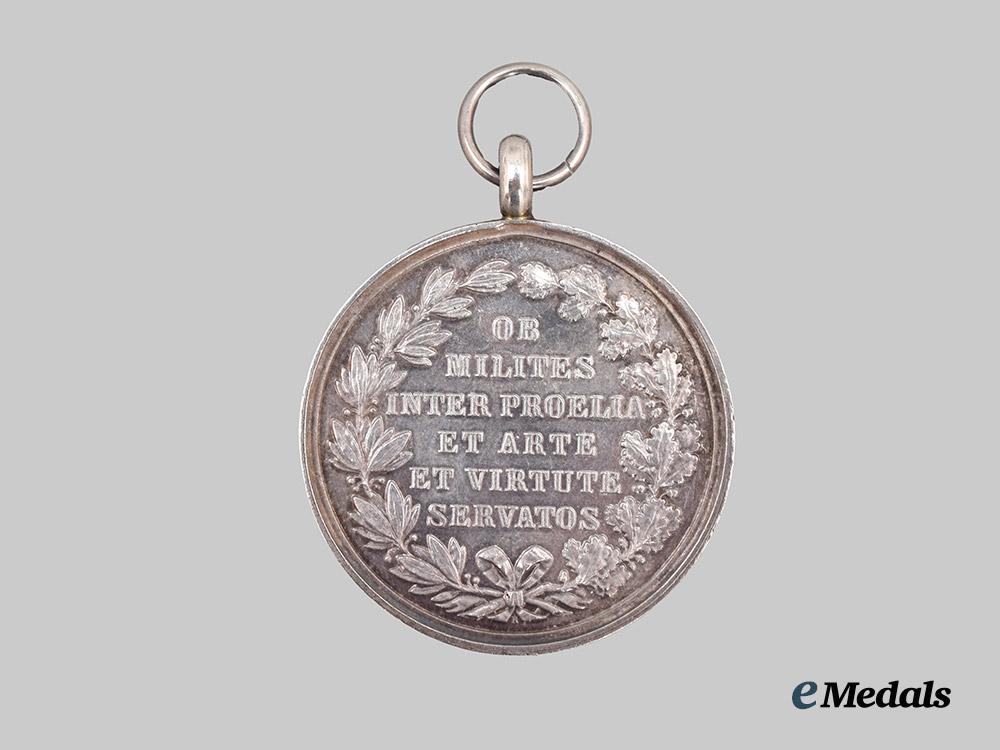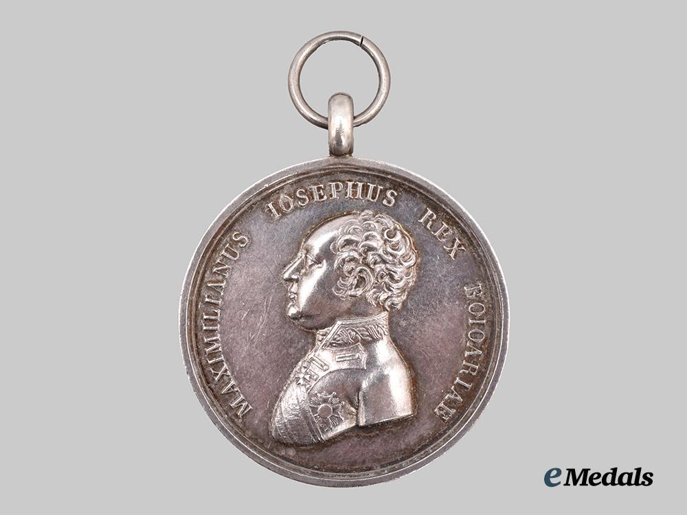 (Silbernes Militär-Sanitätsehrenzeichen). Instituted 8 November 1812 by King Maximilian I Joseph. (1871-1918 issue). Constructed of silver, on loop for suspension, the obverse bearing a raised and leftward-facing profile of King Maximilian I Joseph, circumscribed by name and title in Latin, the reverse bearing a wreathed inscription of “OB MILITES INTER PROELIA ET ARTE ET VIRTUTE SERVATOS” (“FOR RESCUE CARRIED OUT WITH SKILL AND COURAGE IN WAR”), the obverse engraver marked “LOSCH”, measuring 40.72 mm in diameter, weighing 28.8 grams, accompanied by its original presentation case, constructed of a pressed card stock frame with a faux maroon leather exterior liner, the interior with a white rayon lid liner and a dark blue felt medal bed, closing with a functional metal snap button, unmarked, measuring 60 mm (w) x 75 mm (l) x 20 mm (h), a high-quality recipient’s replacement piece or exhibition example produced c. 1930, in near extremely fine condition.