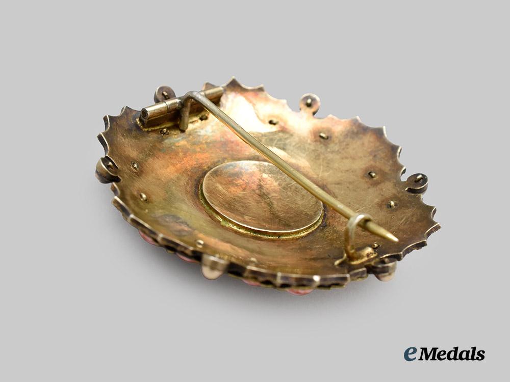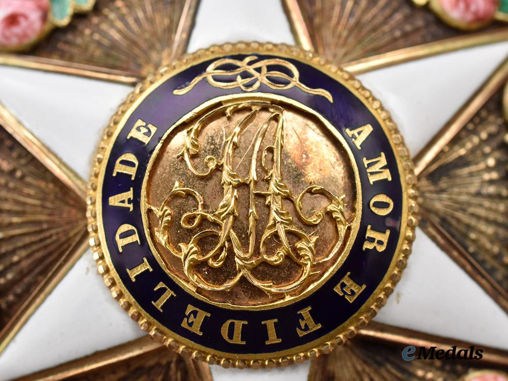 (Imperial Ordem da Rosa). Instituted October 17, 1829 by Dom Pedro I. In silver gilt, a six armed white enamelled cross with ball finials, affixed to a solid multi-rayed gilded plate with three pink enamelled roses on green enamelled laurels in each quadrant creating a wreath, the obverse medallion in Gold presents the hand-chiselled medallion of Pedro I, surrounded by a blue enamelled ring with the inscription AMOR E FIDELIDADE (Love and Fidelity), the reverse presents a single pin assembly, measures 54.8mm (w) x 53.7mm (h), weighs 35.77 grams, the enamels exhibit very minimal wear and the roses are in pristine condition, the inscription ring is rotated but secure, gilt wear on the plate, overall a near extremely fine decoration of the utmost beauty.