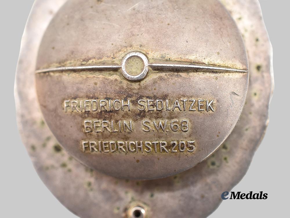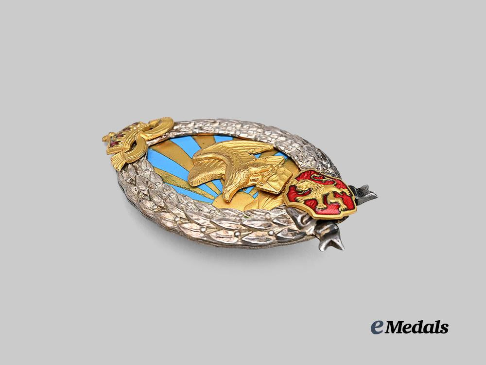 Constructed of gilded and silvered brass with multi-coloured enamels, the obverse consisting of an oval laurel and oak leaf wreath, joined together at the bottom by a ribbon defaced by a red enameled shield bearing a gilded lion rampant, topped by a gilded Bulgarian imperial crown, surrounding a central gilt and enameled sunrise, in turn overlaid by a gilded Bulgarian national eagle preparing to take flight, the reverse topped by a stabilizer and with four rivets securing the obverse features in position, with a central threaded screw post retaining an original backplate, the latter bearing a distributor’s mark of “FRIEDRICH SEDLATZEK, BERLIN S.W. 68, FRIEDRICHSTR. 205”, measuring 37.25 mm (w) x 58.27 mm (h), weighing 26.6 grams, a German-made example (possibly issued to a Luftwaffe serviceman for distinction on the Eastern Front at the behest of Bulgarian authorities) in extremely fine condition.