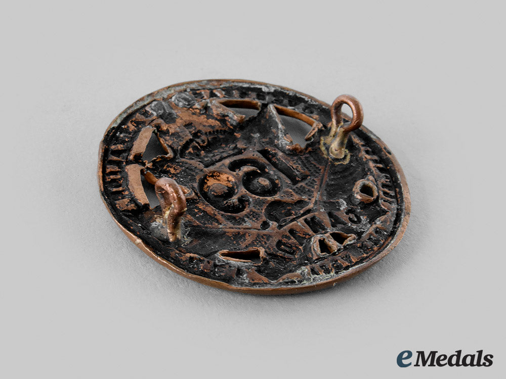 Type I with "C.E.F. Rex Vocat". In browning copper, voided, measuring 39.3 mm in diameter, both lugs intact, surface wear, contact marks, very fine.
