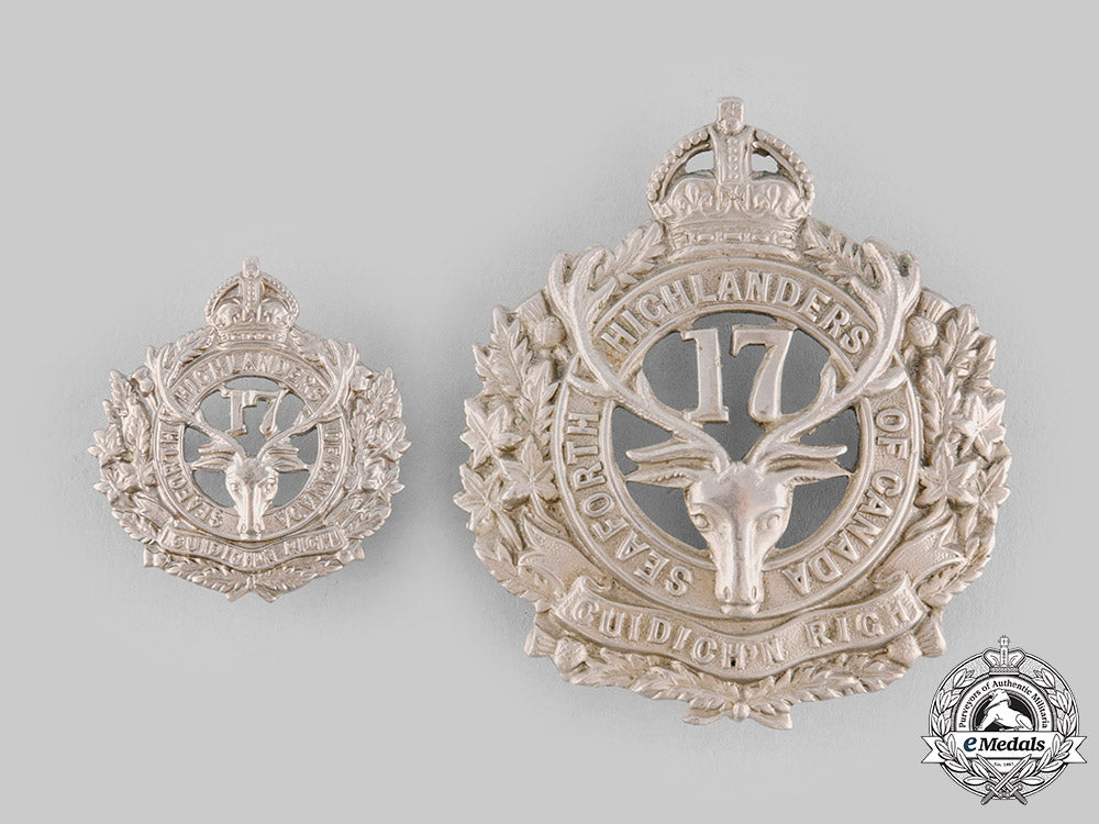 "Nova Scotia Highlanders"/"Seaforth Highlanders of Canada". Glengarry Badge: in white metal, voided, measuring 51 mm (w) x 58 mm (h), both lugs intact; and Collar Badge: in white metal, voided, measuring 29.8 mm (w) x 31.8 mm (h), both lugs intact. Extremely fine.