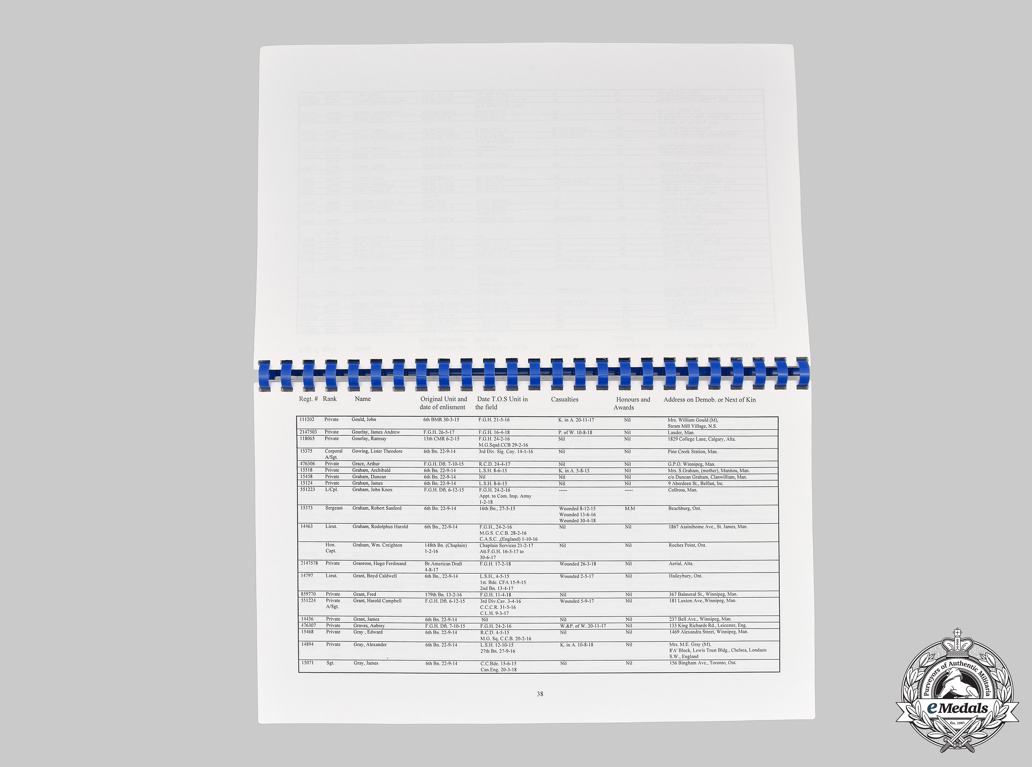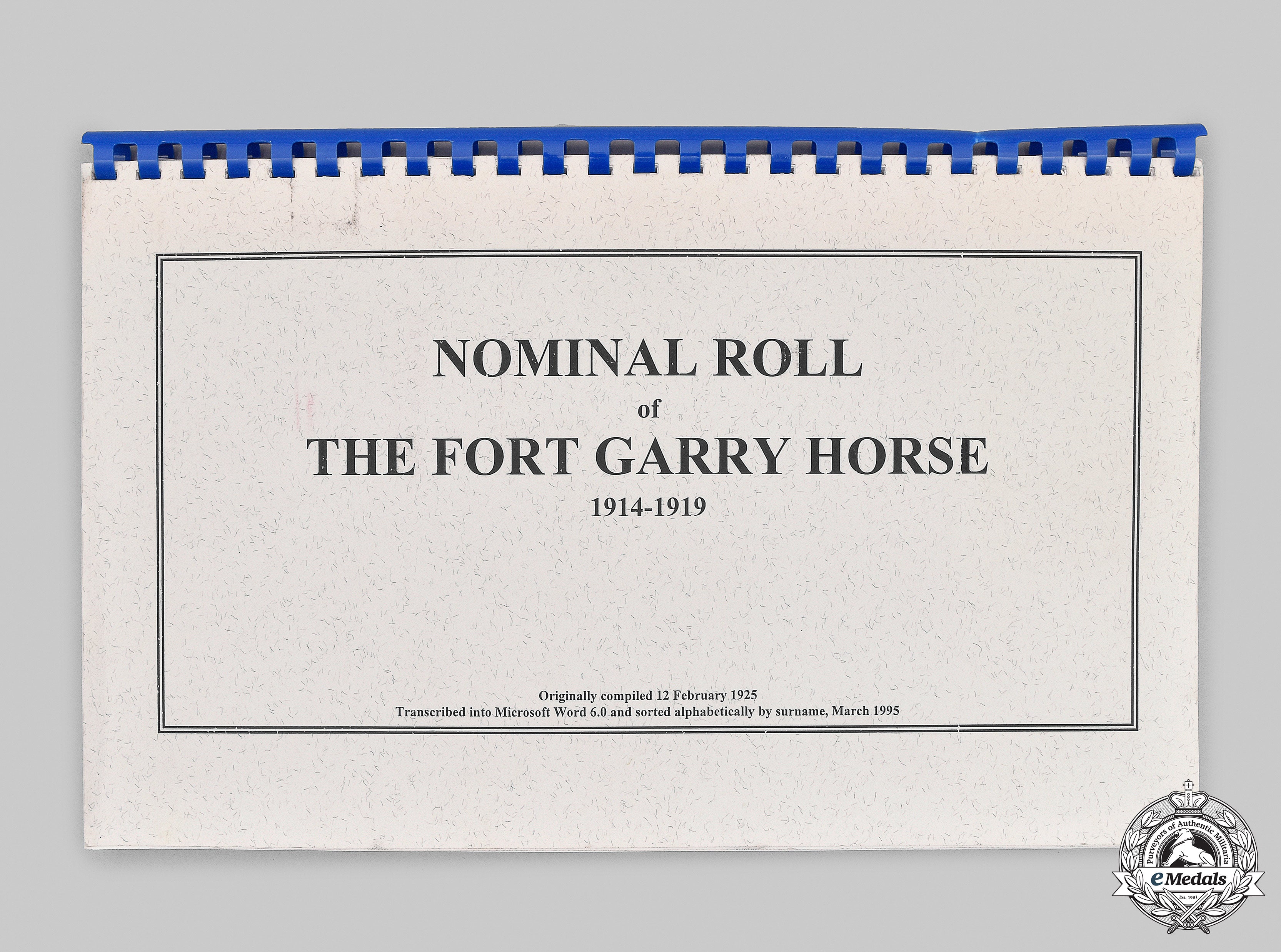 oftcover, speckled light gray cover, entitled "Nominal Roll of The Fort Garry Horse 1914-1919", originally compiled on February 12, 1925, transcribed into Microsoft Word 6.0 and sorted alphabetically by surname in March 1995. It begins with the title page, followed by four pages under the heading "Guide to Rank and Unit Abbreviations and Numbered Battalions", which is divided into three sections: 1. C.E.F. Numbered Battalions, 2. Unit Abbreviations, and 3. Ranks, Honours and Other Abbreviations. The remaining 113 pages lists the participants alphabetically by surname, with information on each man listed over seven columns regarding their Service Number, Rank, Original Unit and Date of Enlistment, Date Taken on Strength in the Field, whether they were a Casualty, Honours and Awards, and Address on Demobilization or Next-of-Kin. The book contains 118 pages of text, printed in black ink, on a white paper stock, 25-ring blue Cerlox bound, measuring 355 mm (w) x 215 mm (h) x 14 mm (d). Offset marks and light curling evident on the front cover, however, the text of the book remains pristine. Better than very fine.
