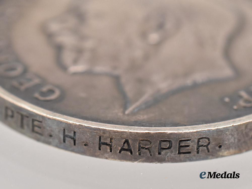 A British War Medal, silver, full size, rim impressed 11140 PTE. H. HARPER. 4-CAN.INF., original ribbon, dark patina, in extremely fine condition.