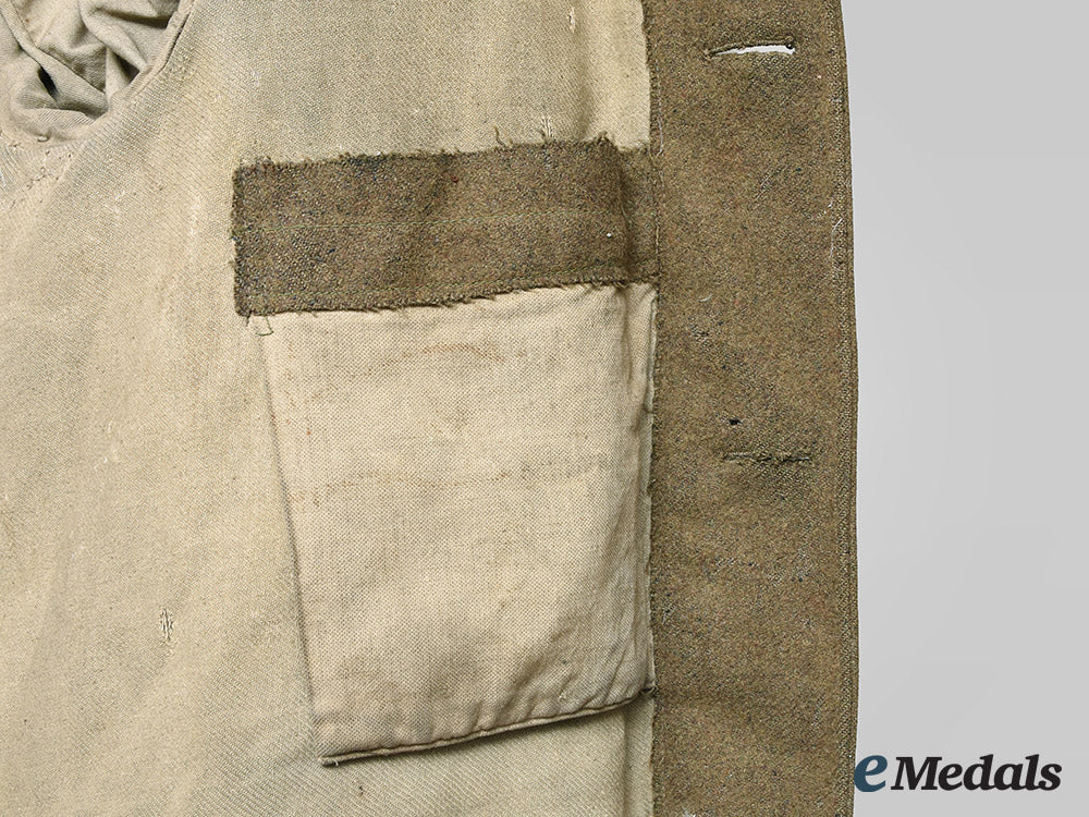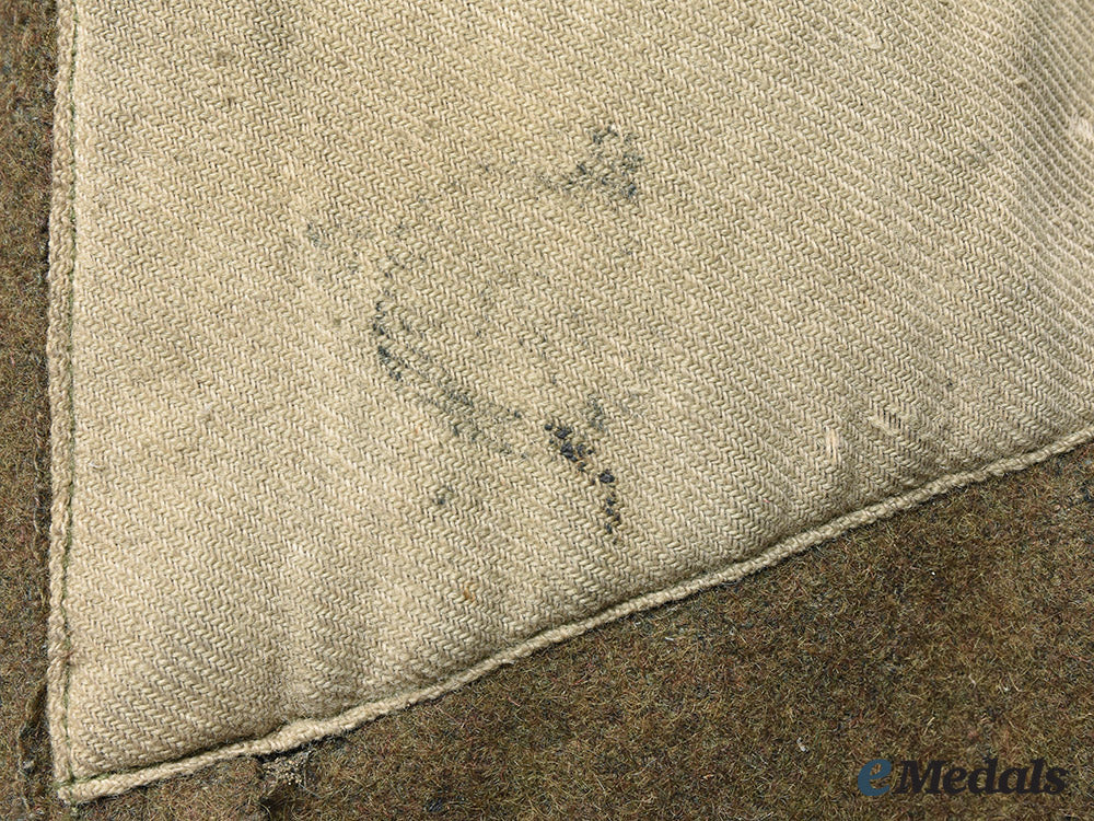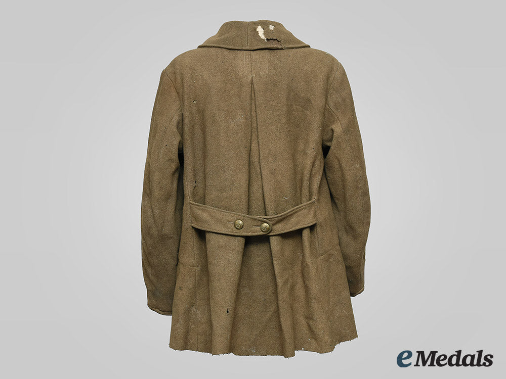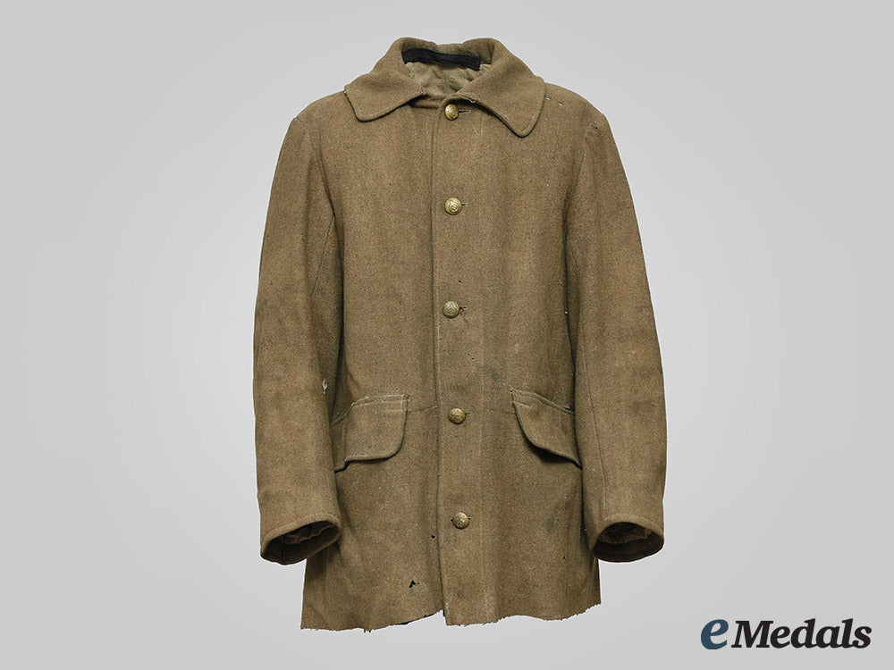 A khaki green wool coat, unlined, with a rounded stand and fall lay-down collar, the collar has a single metal hook and loop (for additional closure), the centre right bears five brass circular shank buttons consisting of a central maple leaf encompassed by a border inscribed with “HONI SOIT QUI MAL Y PENSE” (MAY HE BE SHAMED WHO THINKS BADLY OF IT), topped with “CANADA”, the reverse of the buttons are unmarked (these are called general service buttons), the centre left bears five corresponding stitched reinforced buttoning holes, the left and right panels bear no outer breast pockets, the waist pockets are flapped and non-pleated, measuring 225 mm x 175 mm, an upper sleeve bore a sergeant chevron but the chevron has been removed, the back bears a central pleat and a half belt of the same khaki green wool with two general standard service buttons and two corresponding stitched reinforced buttoning holes, the interior bears a partial cream coloured liner and a left breast pocket with no flap measuring 160 mm x 200 mm, this particular coat had been altered in the field and cut just below the waist, measuring 510 mm (across shoulders), 655 mm (shulder to cuff), 865 mm (total length), apparent mothing throughout garment due to wear and age, but otherwise fine.
