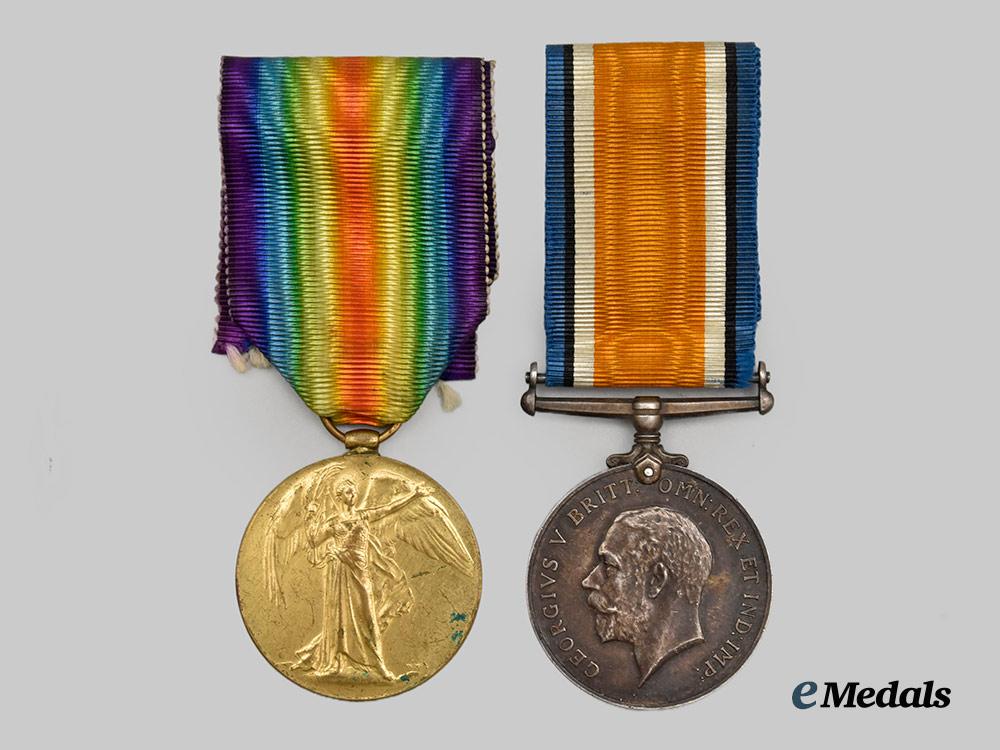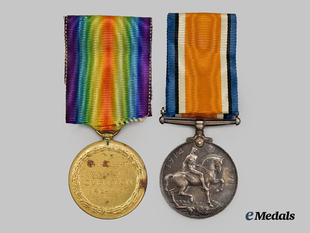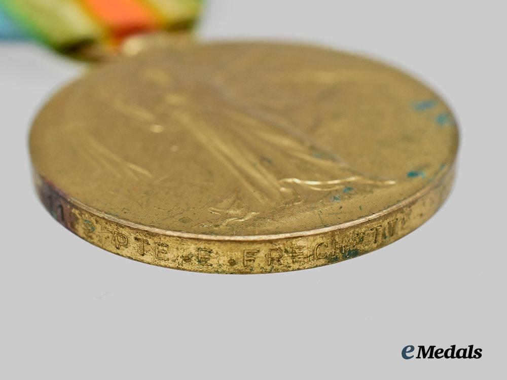2. A United Kingdom Victory Medal. Instituted September 1st, 1919. Consisting of a circular bronze medal, the obverse depicting a winged, full-length, full-front, figure of “Victory” with her left arm extending and holding a palm branch in her right hand, the reverse inscribed “The Great War for Civilisation” in capitalized lettering within a full laurel wreath, inscribed on the edge “61122 PTE. E. FRECHETTE, 22-CAN. INF.”, measuring 36.2 mm in diameter, in very fine condition.