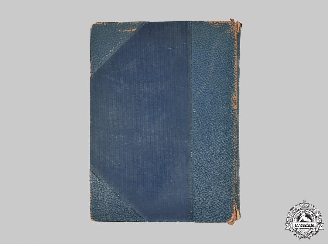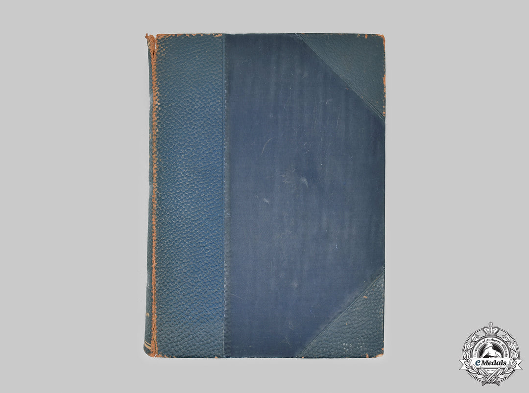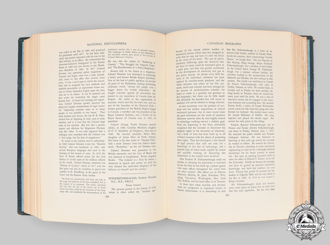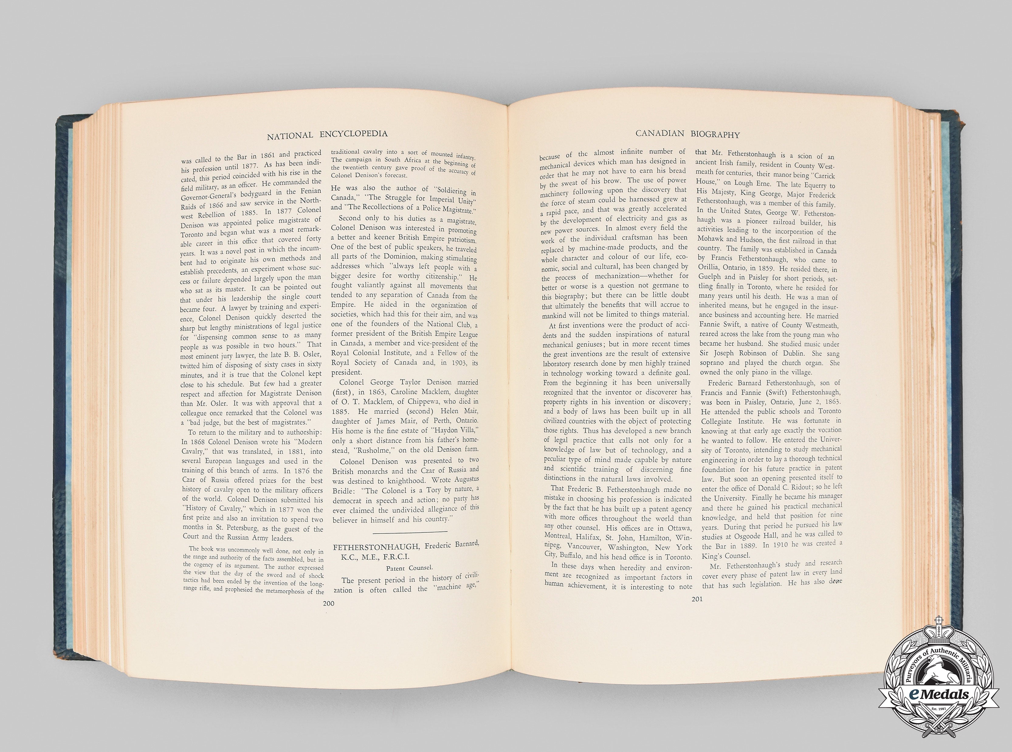 Hardcover, Oxford blue cloth cover, with a pebbled Prussian blue leather strip placed on the spine that wraps around to the front and back covers, along with triangular pieces in the upper and lower corners on the front and back covers, entitled "National Encyclopedia of Canadian Biography", the title in gold-coloured ink and library reference marked "920 Ref" in white marker on the spine. The book credits two Directing Editors with its creation, Jessie Edgar Middleton and W. Scott Downs, and was published by The Dominion Publishing Company, Limited of Toronto, Ontario in 1935. The book begins with a Preface by The Dominion Publishing Company, Limited, that states the basic purposes and content within, as of 1935: "The National Encyclopedia of Canadian Biography is designed to serve Canada as the other national collections of biography serve their respective countries. Canada, standing in full statute among the powers of the world, deserves to have the record of her achievement, as written in the lives of her men and women who have contributed to her greatness, placed in enduring form. Thinking people everywhere are alive to the importance biography, and not alone the biographies of great leaders but of all those who achieve in their particular department of life, whether in science, in law or medicine, in the arts, in industry or invention, in the pulpit or press, or in any other activity in life. These volumes are to contain splendid records of foremost citizens, those whose minds could "furnish forth empires," but they also are to perpetuate the records of those lives in which merit and accomplishment, without the spectacular, predominate. The National Encyclopedia of Canadian Biography has as its purpose the recording of the "innumerable biographies" which Carlyle declared "are the essence of history" and which, because of the greatest complexity of modern life, we "need to have written" more than in any previous period. The value of such a series to libraries and reference centres has been demonstrated beyond the need for discussion, and the literary and advisory cooperation that have been freely extended have been most heartening. Research and compilation are going forward without interruption, and the "Encyclopedia" will grow in volume and importance with the passing of time." This particular volume was part of the Reference Section of the Westminster Hospital Library in London, Ontario, as evidenced by its numerous markings. There is a label placed on the inside front cover inscribed "For Reference / Do Not Take From This Room", as well as being stamped in black ink "Westminster Hospital Library" on the front endpaper and "Westminster Hospital /Dept. of Veterans Affairs / Library" on the page facing the Preface and on the back endpaper. The book contains 398 pages of text of biographies of Canadians who have achieved status in science, in business, in law, in politics, in medicine, in the arts, in industry, in religion, in the military, as educators, etc., printed in black ink, on a thick newsprint-like stock, with over sixty black and white photographs of prominent Canadians, along with a facsimile signature at the base of each photo, printed on the same type thick newsprint-like stock or on a bright white paper stock, interspersed throughout the book, each of the photographs with a vellum insert to protect them from the text, with gold leaf on the top of the pages, the book weighing 2.2 kilograms, measuring 195 mm (w) x 275 mm (h) x 62 mm (d). It exhibits wear along the edges and seams on the cover, the extensive wear on the top and bottom of the spine exposing the underlying paper binding support, light soiling on the edges of the pages, with most of the photographs printed on the thick newsprint-like stock having offset onto the adjoining text page, the photographs printed on the bright white paper stock remaining pristine. Fine.