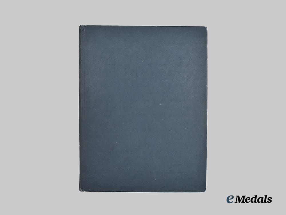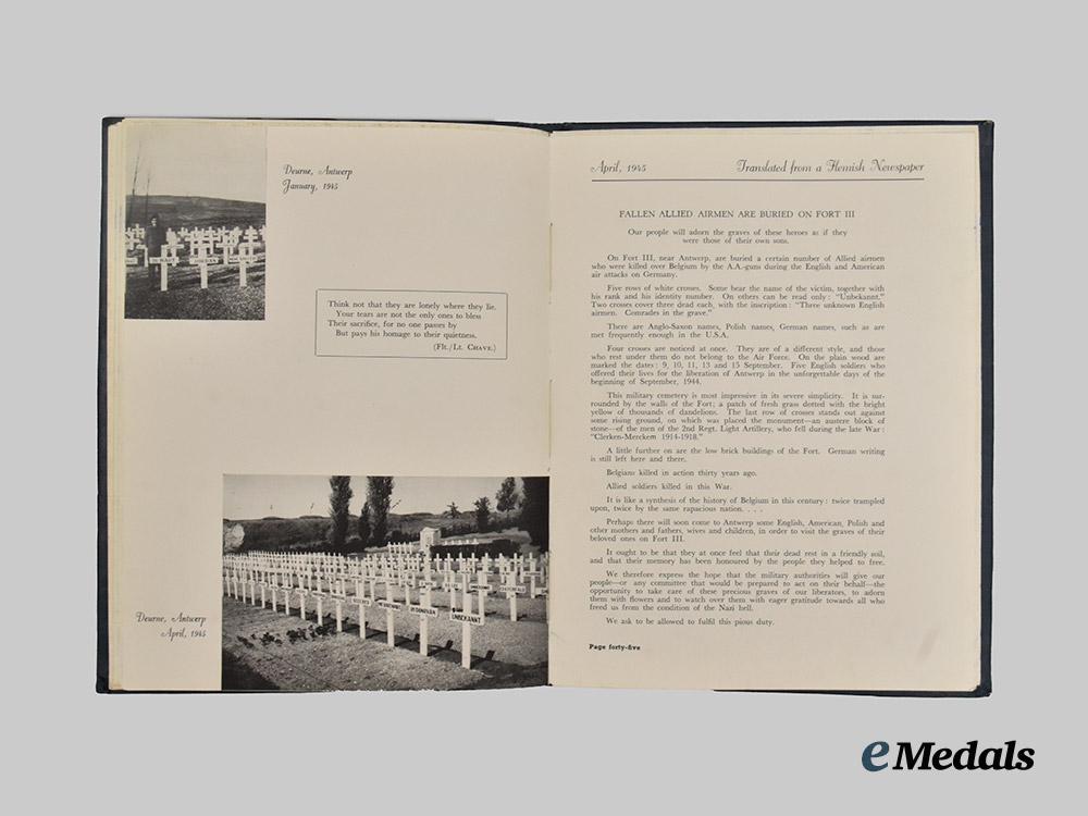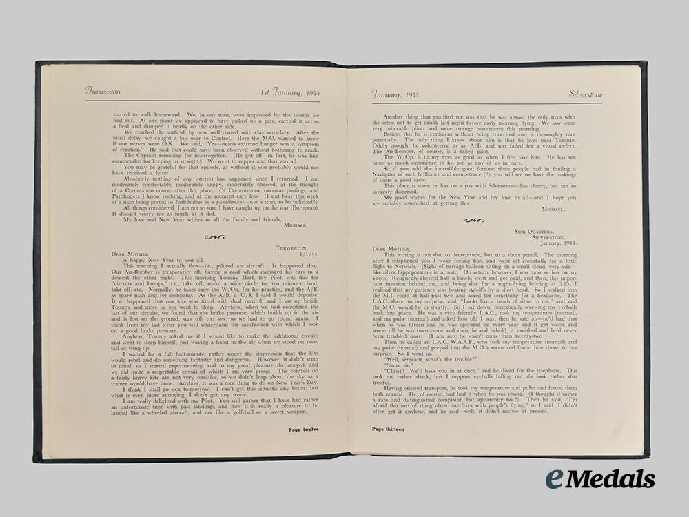 An extremely unique privately made book in remembrance of Sergeant Michael John MacNaughton-Smith who served in the Royal Air Force as a Navigator in a Lancaster bomber. This book contains countless heartfelt letters, including photographs, to his mother while serving in the Royal Air Force, spanning over thirty-seven pages. It concludes with a telegram and letter from E.F. Deas, Wing Commander in Command of No. 630 Squadron of the R.A.F. informing his father that Michael’s aircraft failed to return following a mission taking place on the night of 21st/22nd of June 1944 over the war industries at Wesseling in Germany. It also contains a Letter from the British Red Cross Society and Order of St. John. Further letters contained in this book states that he was buried two days following his disappearance in Grave No. 217 in a cemetery in Antwerp, Belgium. Interestingly, it features further communication between Michael’s parents and the mayor of Deurne (Antwerp) about his burial. The book concludes with several beautiful poems written by Michael during his childhood and youth. It is bound with stiff cardstock covers with a dark blue faux leather exterior. The total length of this book is fifty-one pages, measuring 19 cm (w) x 245 mm (l), in better than extremely fine condition.