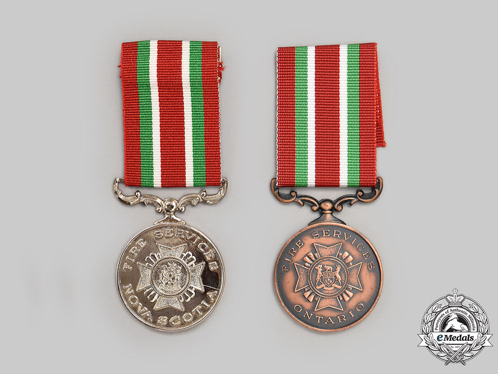2. Nova Scotia Fire Services Long Service Medal: in rhodium-plated red brass, measuring 35.5 mm in diameter, original ribbon with pinback, maker marked "TAIWAN" on the pinback.
