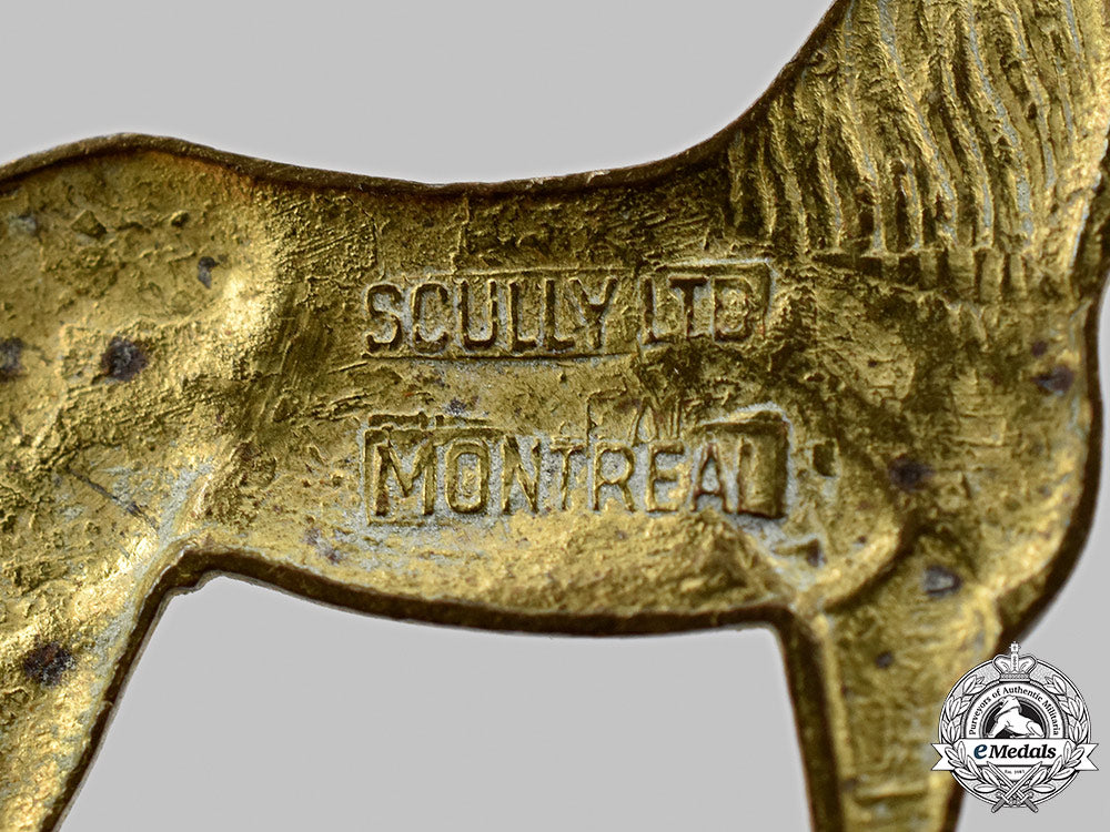 1946-1949 Issue. In brass, maker marked "SCULLY LTD. MONTREAL" on the reverse, measuring 47 mm (w) x 44.8 mm (h), both lugs and pin intact, very light contact, near extremely fine.