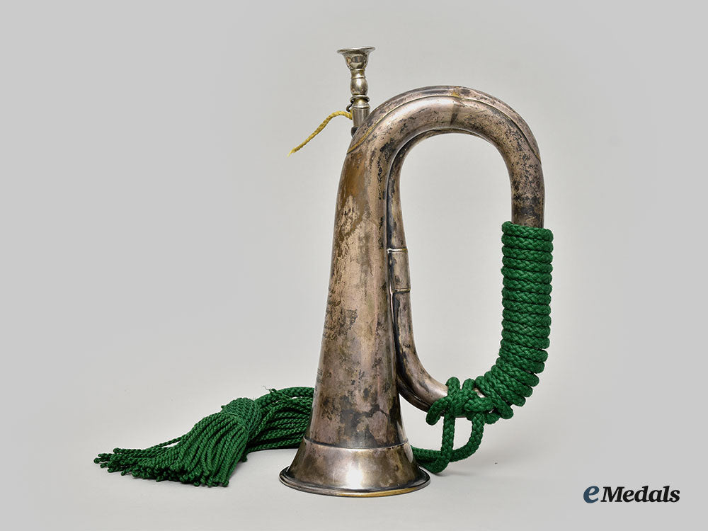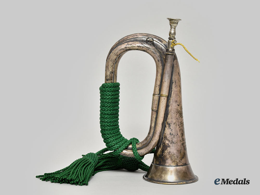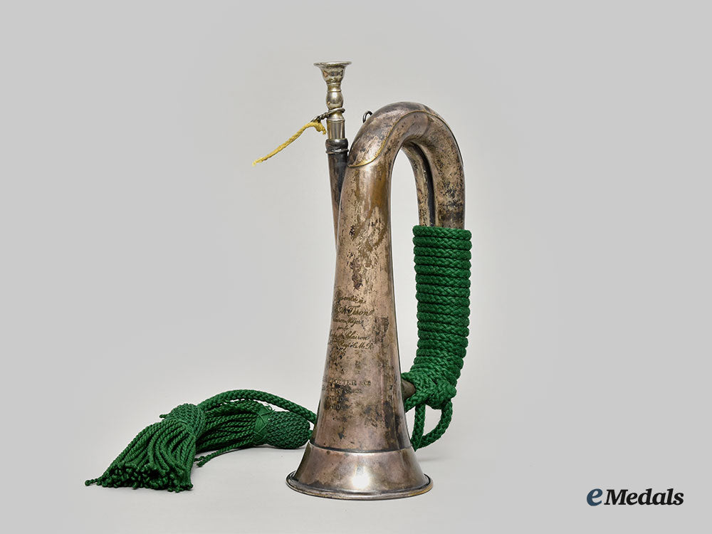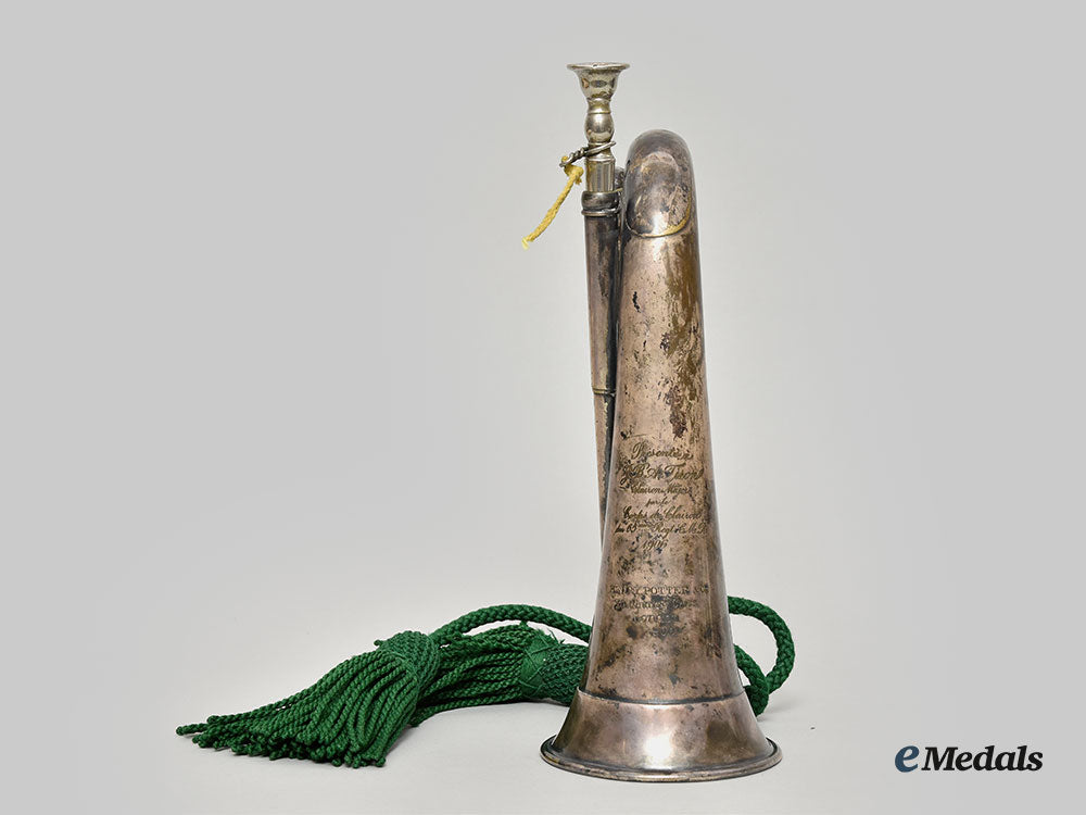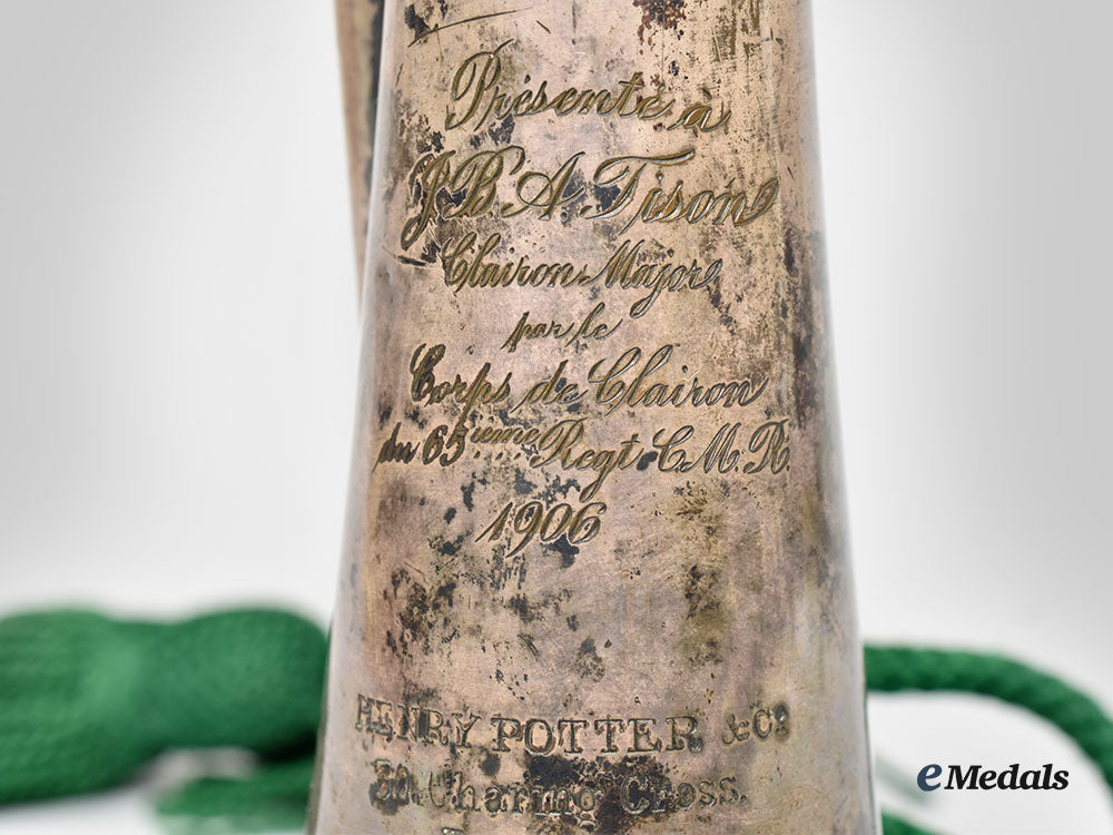 (Carabiniers Mont-Royal). Bugle: in silvered brass, engraved in French in running script "Présente à T.B.A. Tison / Clairon Major / par le / Corps de Clairon / du 65 ième Regt C.M.R. / 1906" (Presented to T.B.A. Tison, Bugle Major, by the Bugle Corps of the 65th Regiment C.M.R. 1906) and maker marked "HENRY POTTER & Co. / 30. Charing Cross. / London / 1900" on the bell tube, measuring 100 mm in width at the bell x 290 mm in length from the bell to the mouthpiece x 175 mm in height, with a braided forest green cord wrapped around the bottom tubing and finished with a large tassel housing an 80 mm long fringe, free of dents; and Baton: gloss black painted shaft with Gold tips placed at both ends, both tips engraved in French in running script, "J.A.B.T. (Tison) / La 7ème Année / Près "par L'Har" (L'Harmonie) Long" / Mai 1910" (J.A.B.T. (Tison) / The 7th Year / Presented by the Harmony Long" / May 1910) on one tip and "Près "par / Clairons 8 ième Regt" / et les Amis" (Presented by Buglers of the 8th Regiment and Friends) on the other tip, measuring 19.5 mm in diameter x 367 mm in length, exhibiting contact marks on the Gold tips and scuffing in a few locations on the black painted finish on the shaft, the baton housed in a wooden box with a sliding lid, the box measuring 385 mm in width x 47.2 mm in depth x 53 mm in height. Rare.